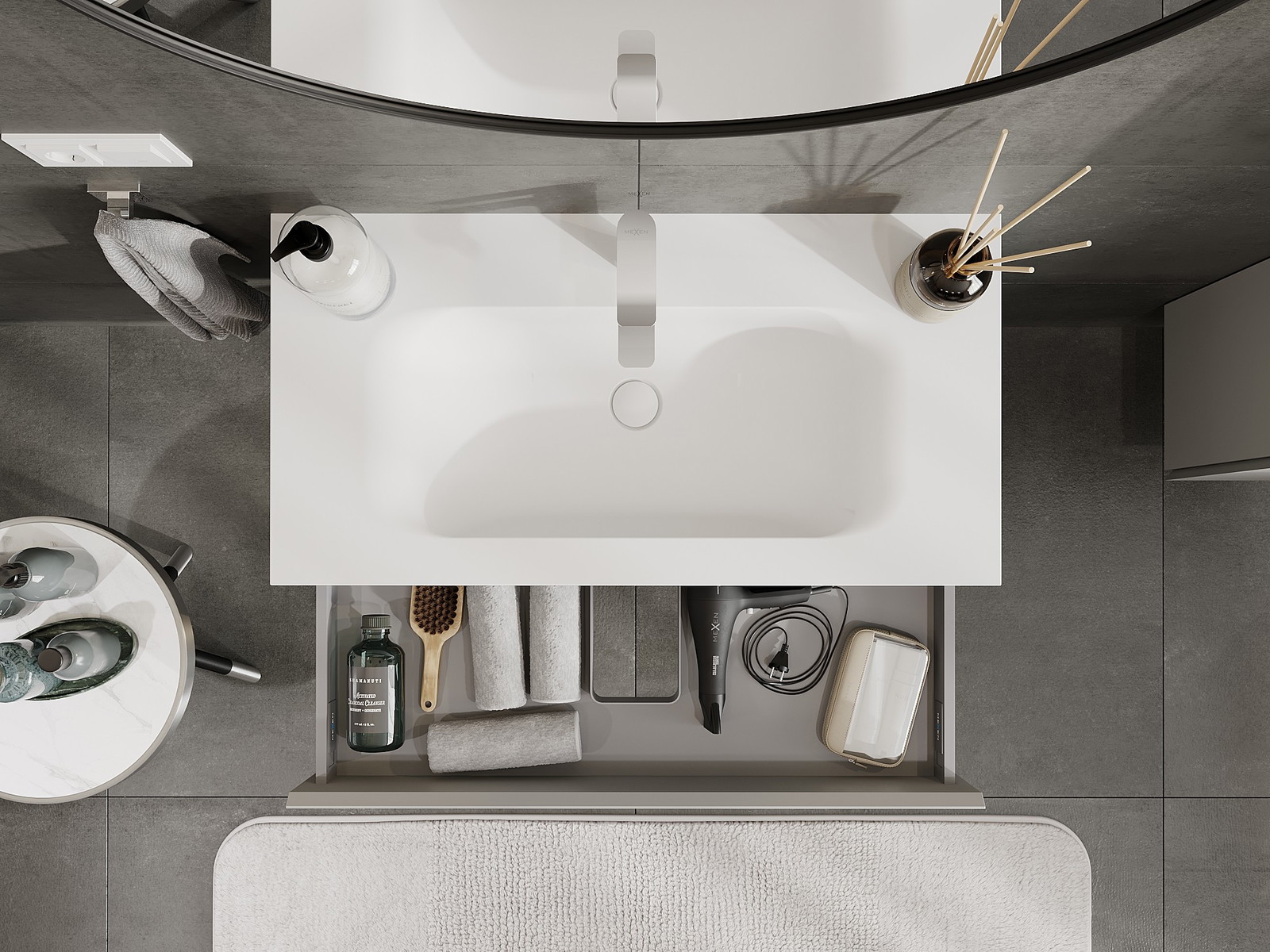 Výrez v zásuvke je navrhnutý tak, aby pojal sifón, ktorý je nevyhnutný v umývadlových inštaláciách. Vďaka tomu môže byť nábytok namontovaný plne funkčne, bez nutnosti vzdávať sa priestoru v zásuvke v prospech inštalácie.