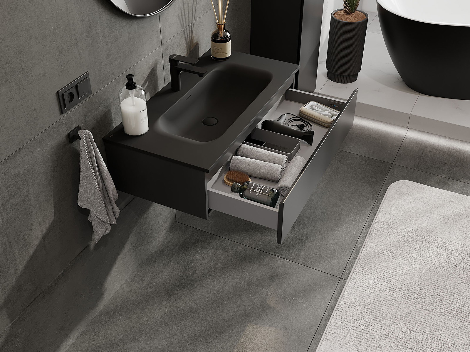 Výrez v zásuvke je navrhnutý tak, aby pojal sifón, ktorý je nevyhnutný v umývadlových inštaláciách. Vďaka tomu môže byť nábytok namontovaný plne funkčne, bez nutnosti vzdávať sa priestoru v zásuvke v prospech inštalácie.