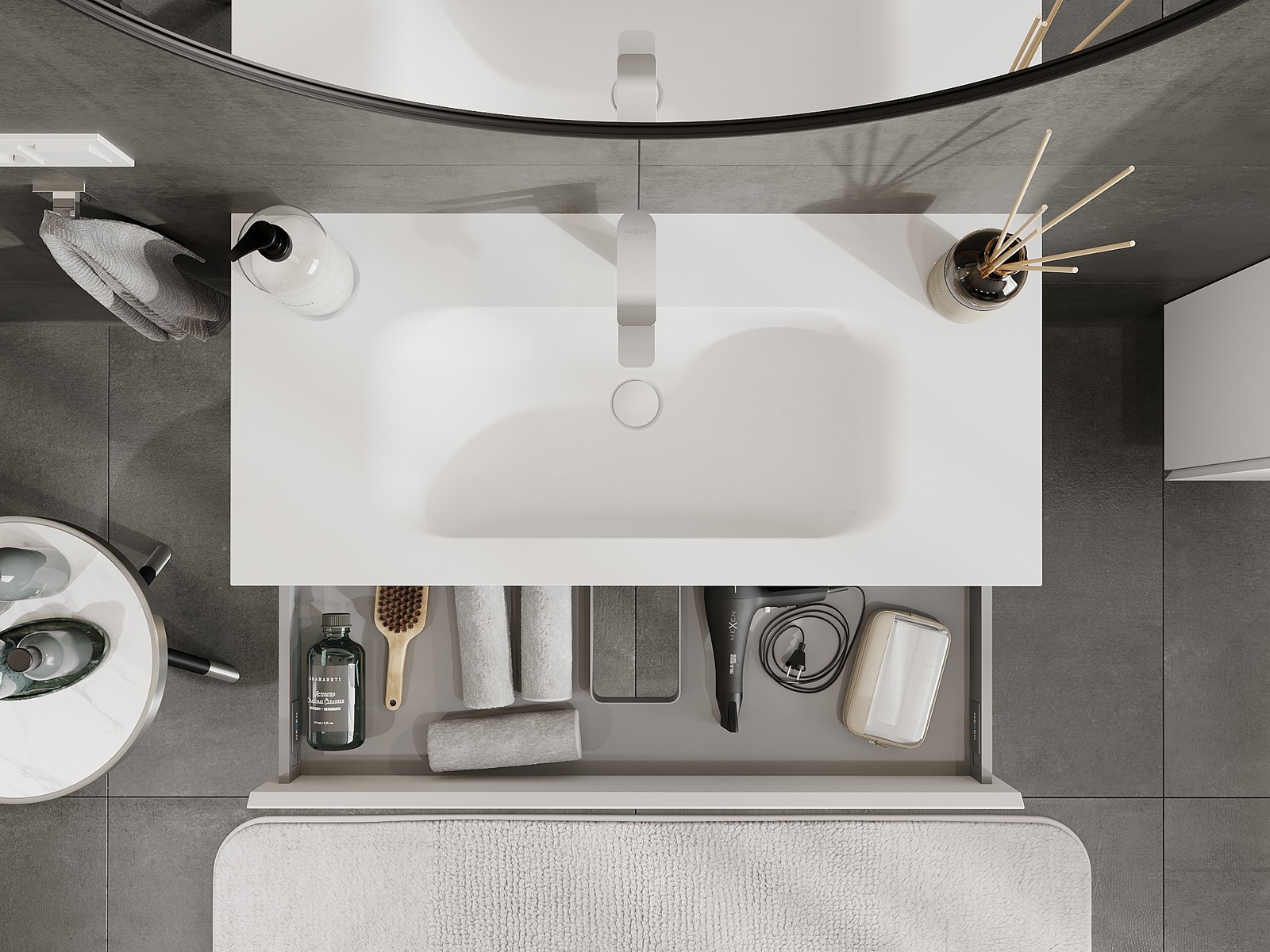 Výrez v zásuvke je navrhnutý tak, aby pojal sifón, ktorý je nevyhnutný v umývadlových inštaláciách. Vďaka tomu môže byť nábytok namontovaný plne funkčne, bez nutnosti vzdávať sa priestoru v zásuvke v prospech inštalácie.