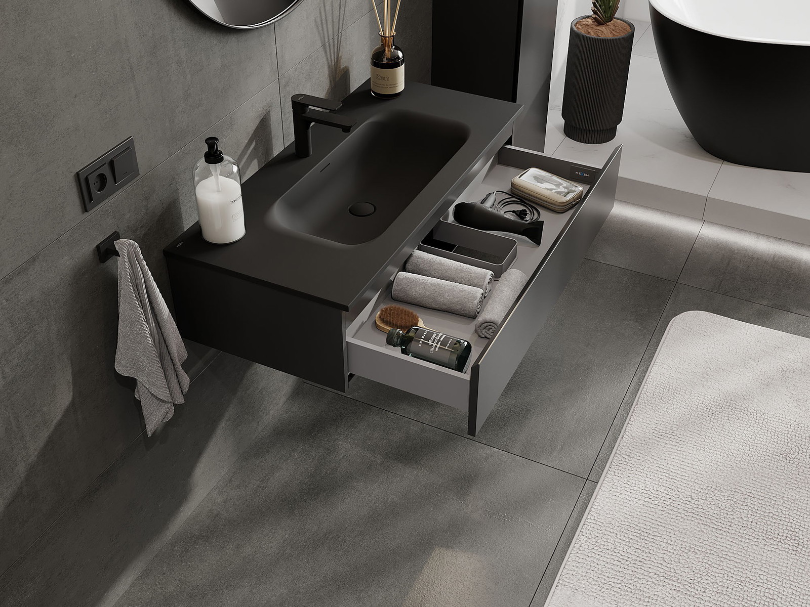Výrez v zásuvke je navrhnutý tak, aby pojal sifón, ktorý je nevyhnutný v umývadlových inštaláciách. Vďaka tomu môže byť nábytok namontovaný plne funkčne, bez nutnosti vzdávať sa priestoru v zásuvke v prospech inštalácie.