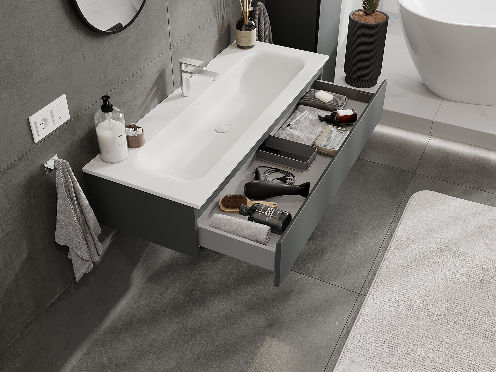 Výrez v zásuvke je navrhnutý tak, aby pojal sifón, ktorý je nevyhnutný v umývadlových inštaláciách. Vďaka tomu môže byť nábytok namontovaný plne funkčne, bez nutnosti vzdávať sa priestoru v zásuvke v prospech inštalácie.