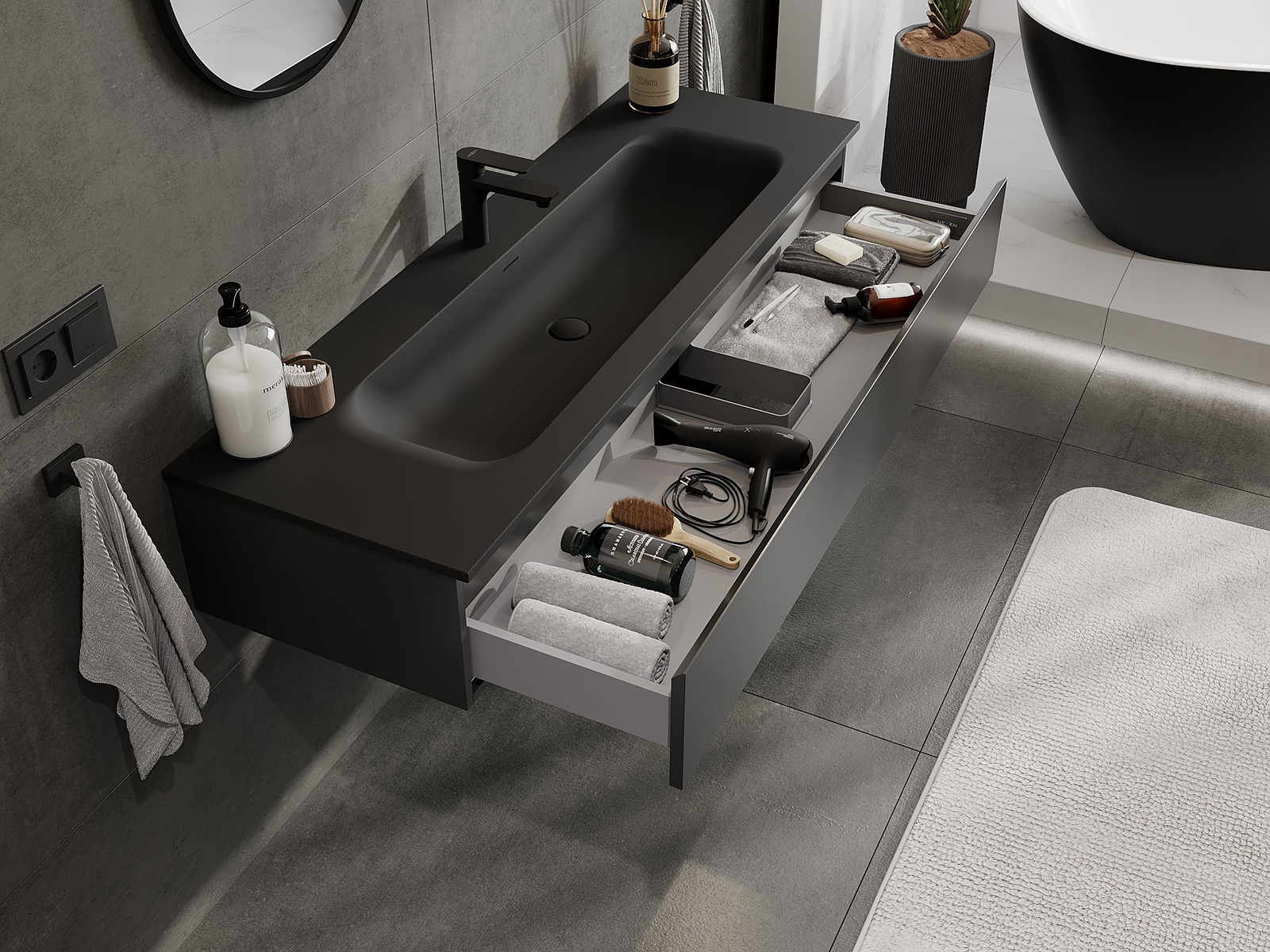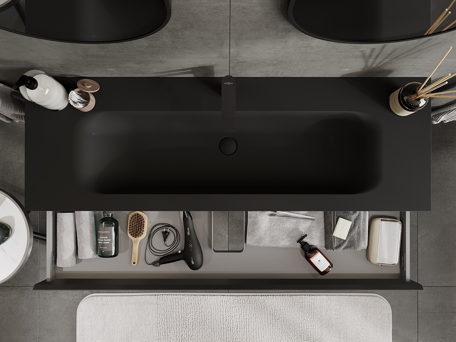 Mexen Orio kúpeľňová skrinka 140 cm s umývadlom Vela, 1 zásuvka, čierna matná - 91A10-14023-1-BF71-W23M71