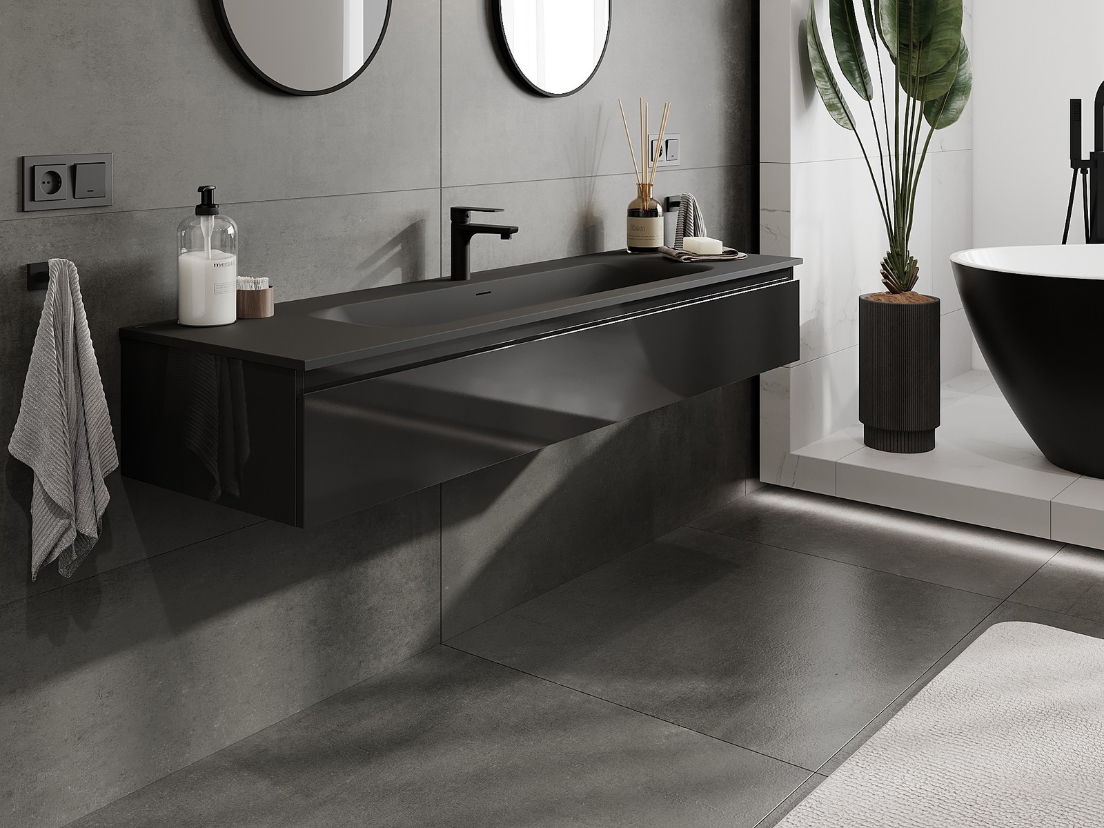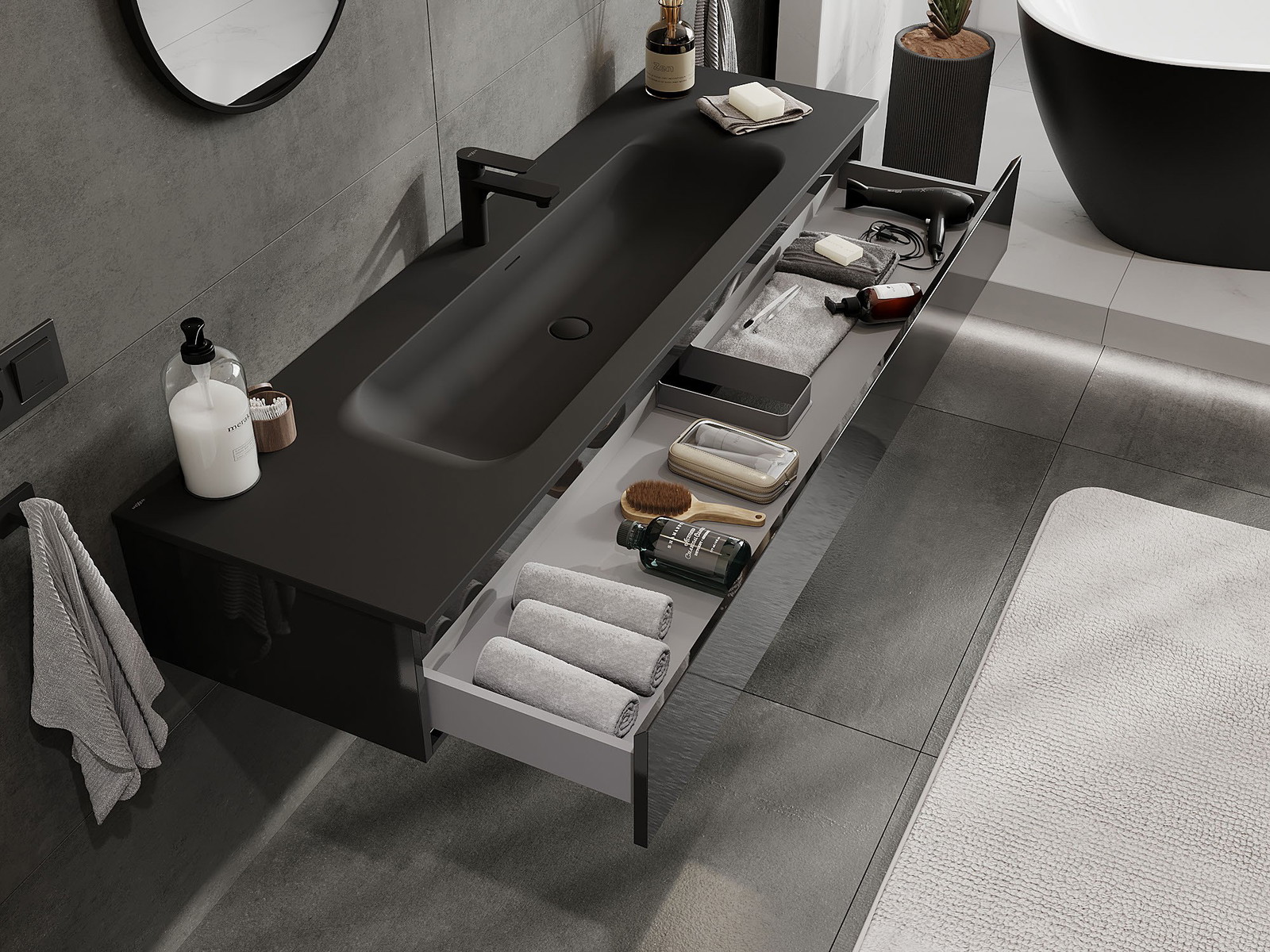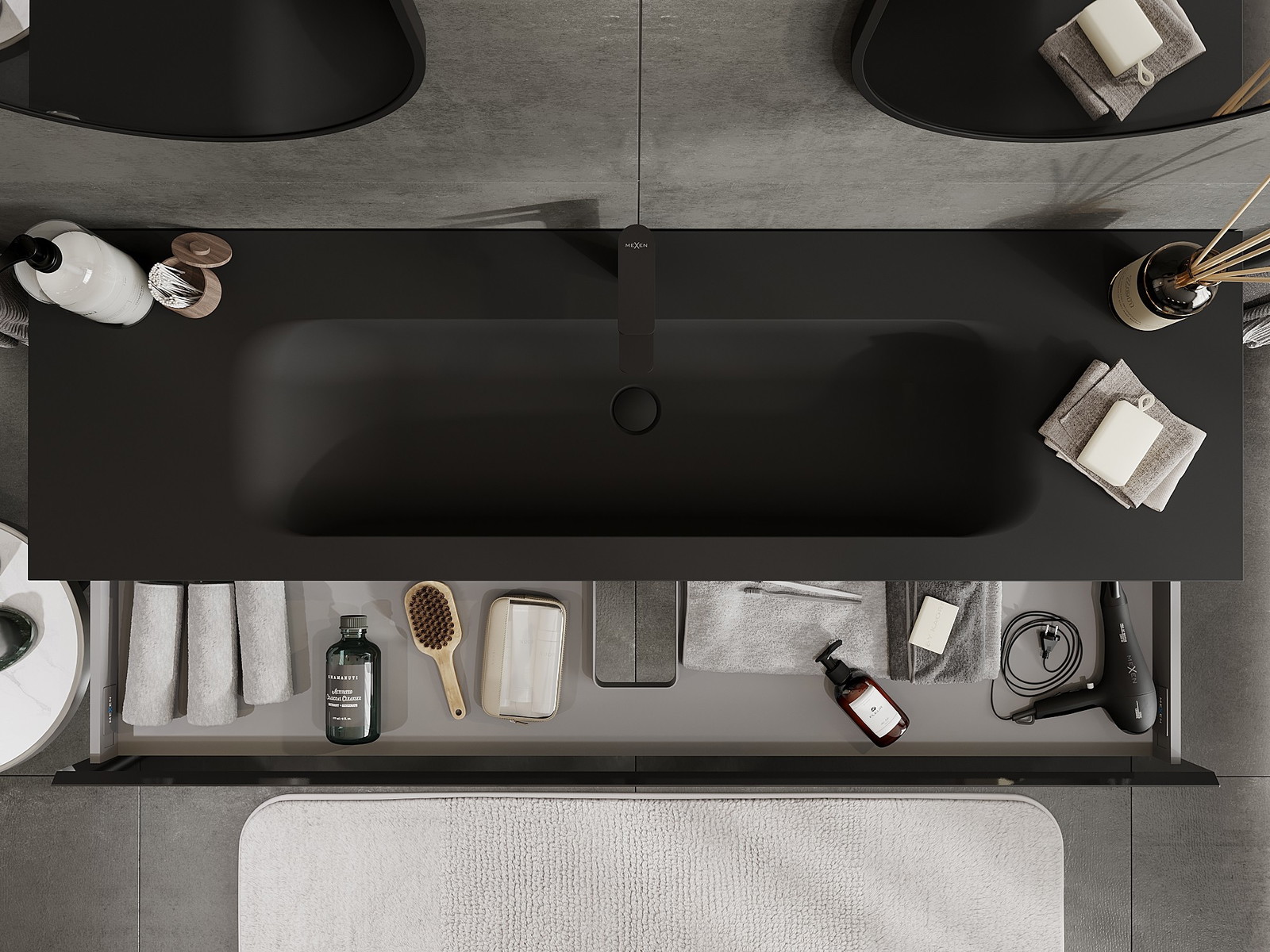 Mexen Orio kúpeľňová skrinka 160 cm s umývadlom Vela, 1 zásuvka, čierny lesk/čierny mat - 91A10-16023-1-BF70-W23M71