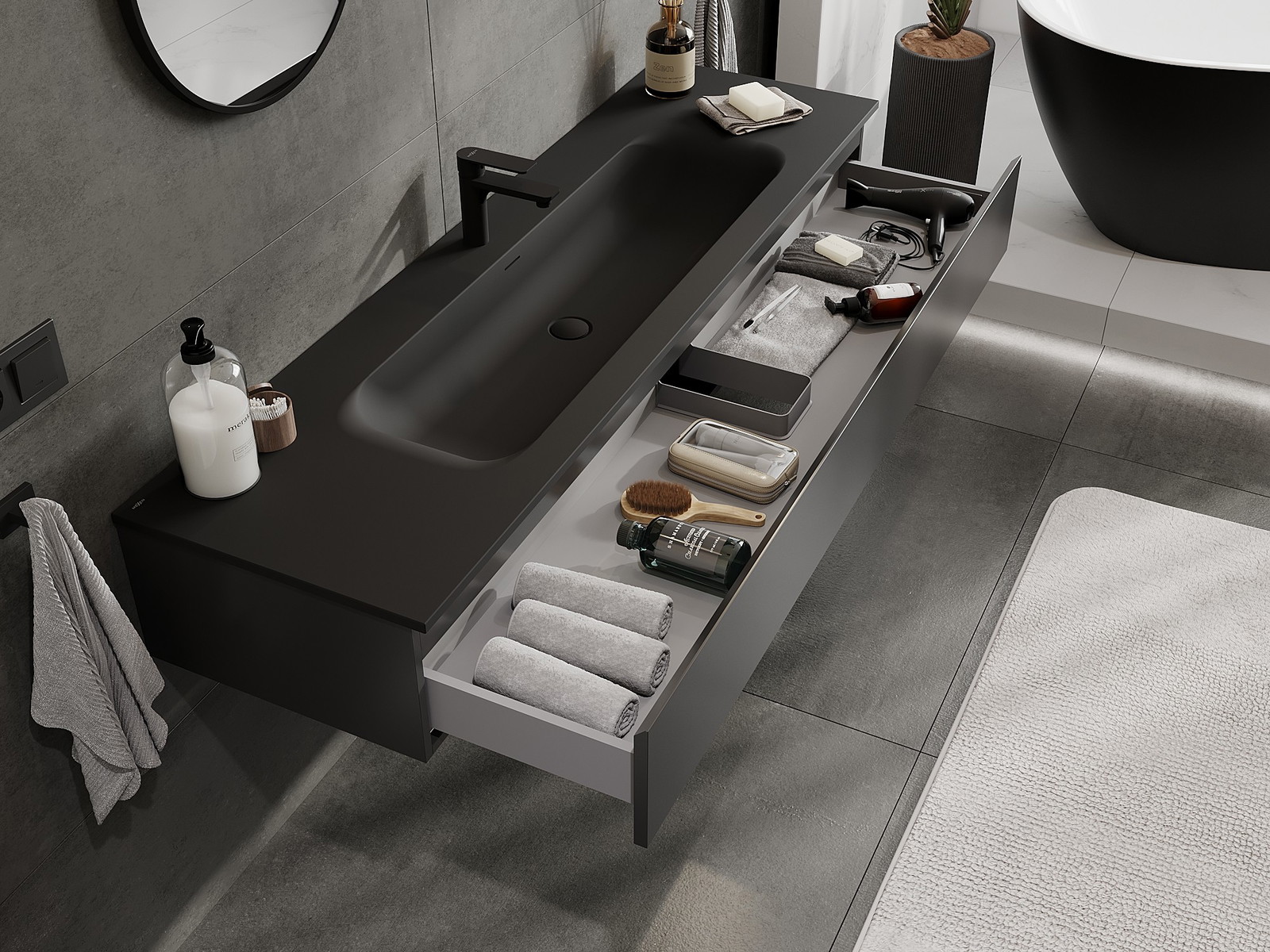 Mexen Orio kúpeľňová skrinka 160 cm s umývadlom Vela, 1 zásuvka, čierna matná - 91A10-16023-1-BF71-W23M71
