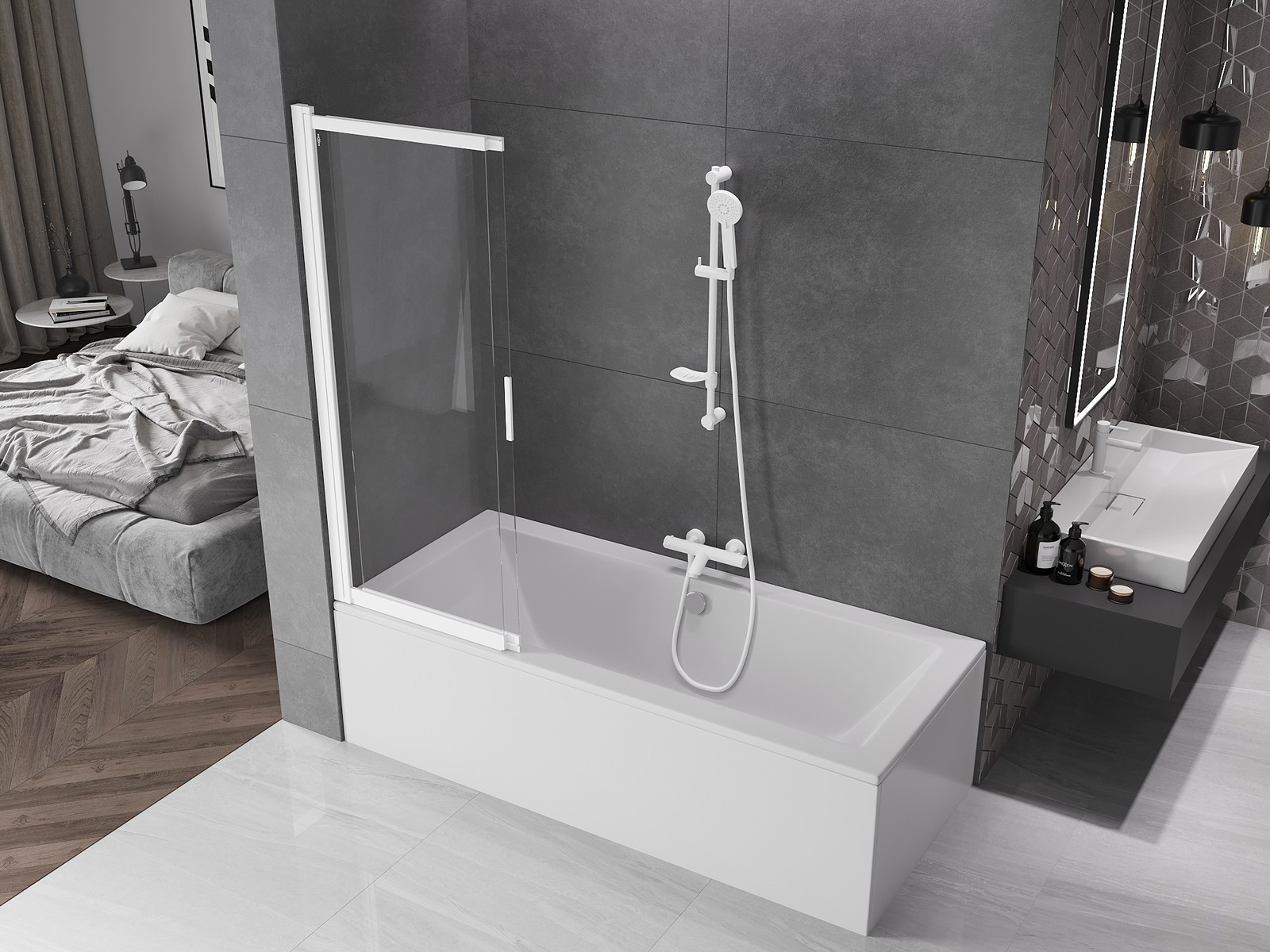 Vďaka použitiu univerzálneho montážneho systému môže byť priečka namontovaná na pravej alebo ľavej strane, podľa potreby. Týmto spôsobom môžete ľahko navrhnúť sprchu prispôsobenú priestoru kúpeľne.