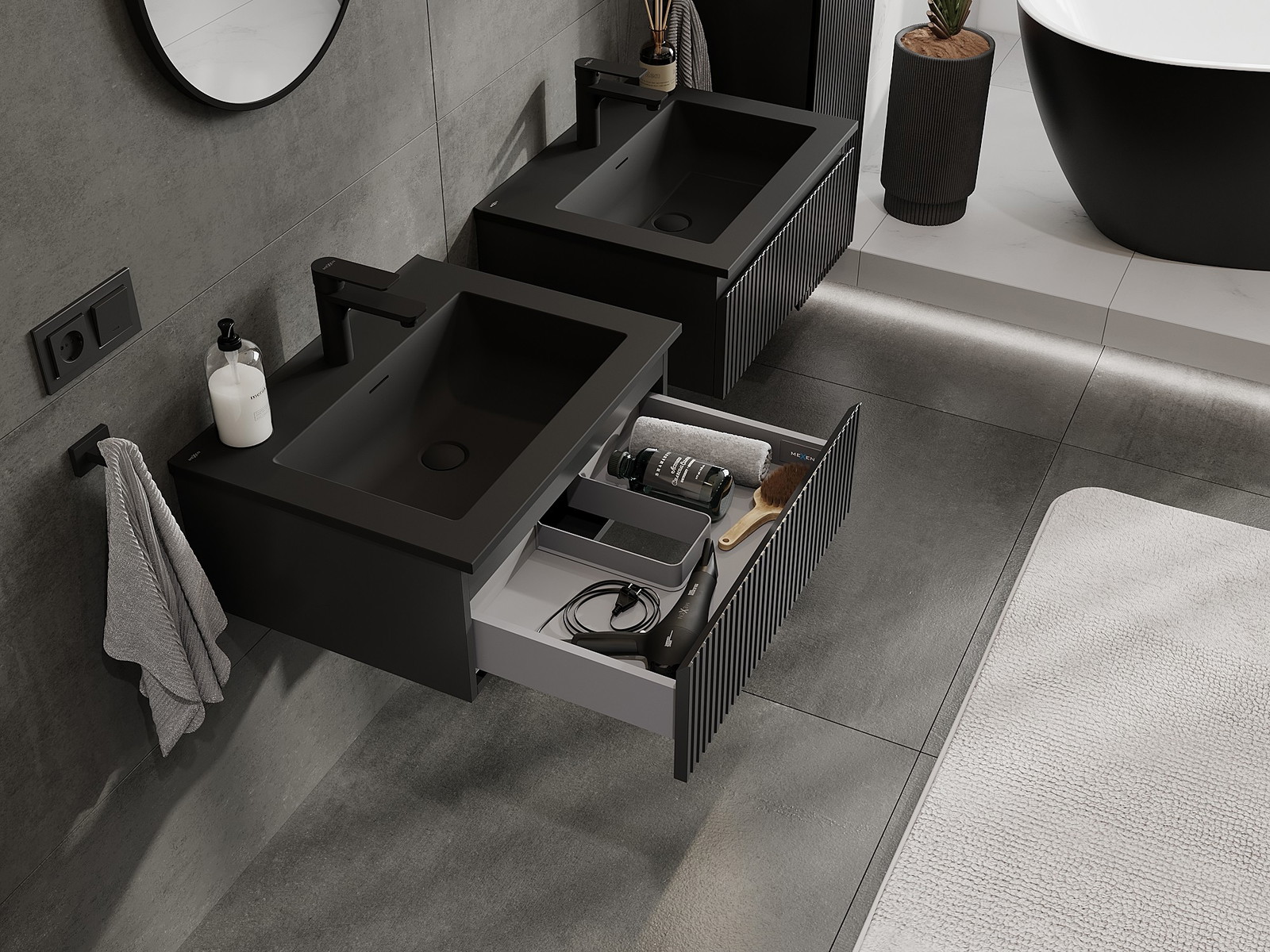 Mexen Rivel kúpeľňová skrinka 60 cm s umývadlom Otis, 1 zásuvka, drážkovaná, čierna matná - 91A20-06023-1-BF71-W18M71
