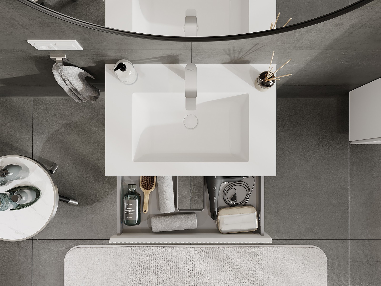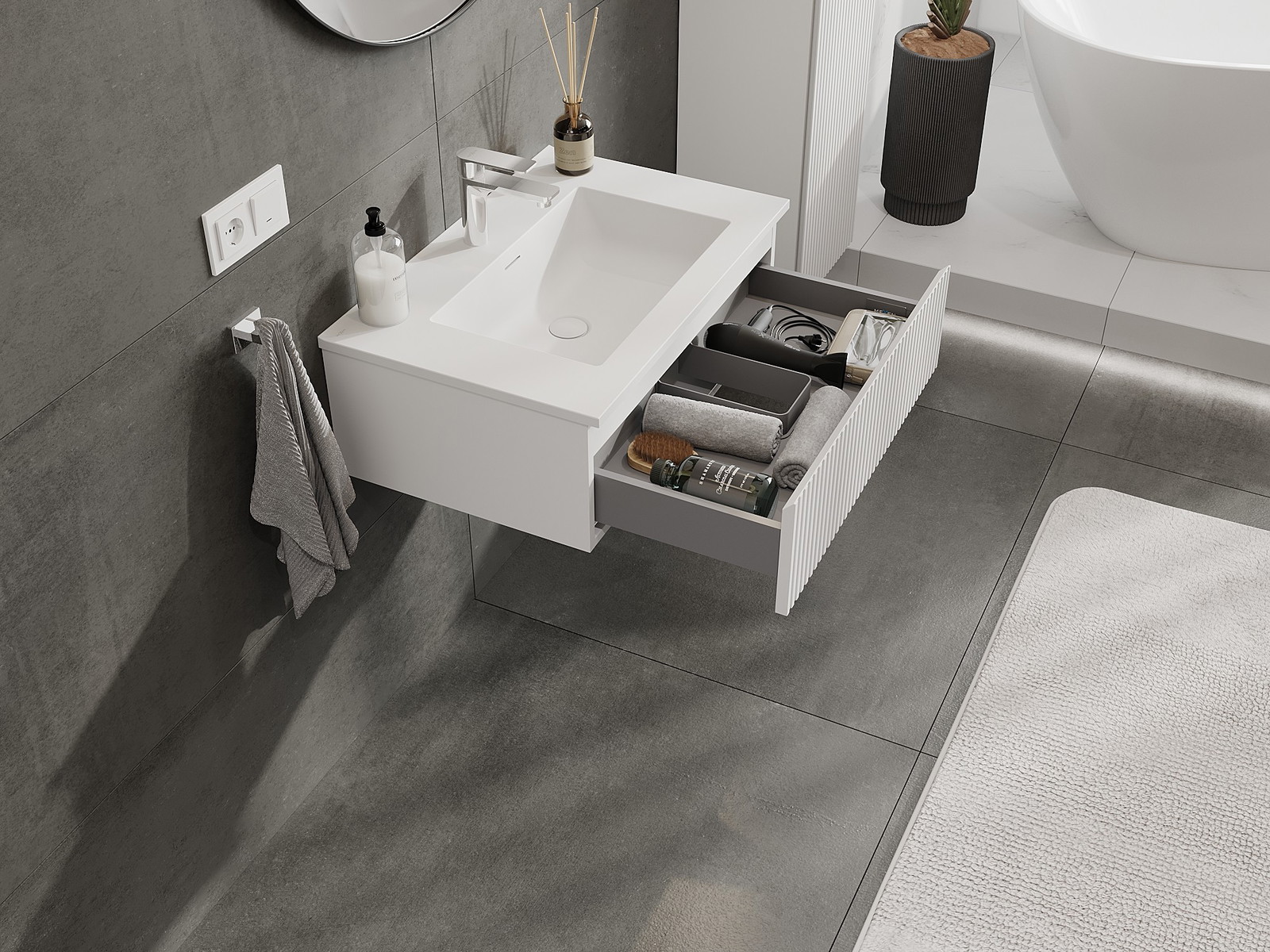 Výrez v zásuvke je navrhnutý tak, aby pojal sifón, ktorý je nevyhnutný v umývadlových inštaláciách. Vďaka tomu môže byť nábytok namontovaný plne funkčne, bez nutnosti vzdávať sa priestoru v zásuvke v prospech inštalácie.