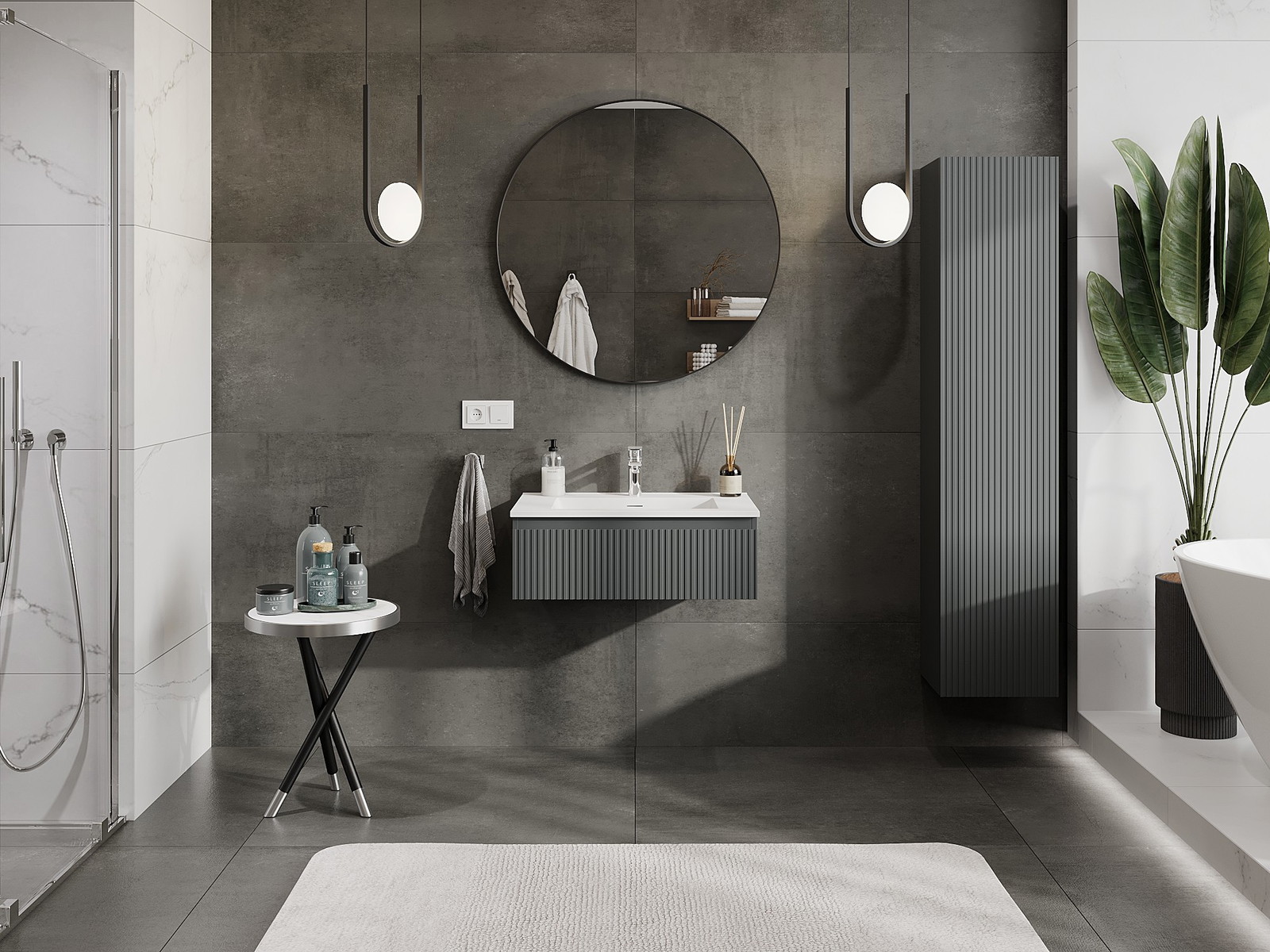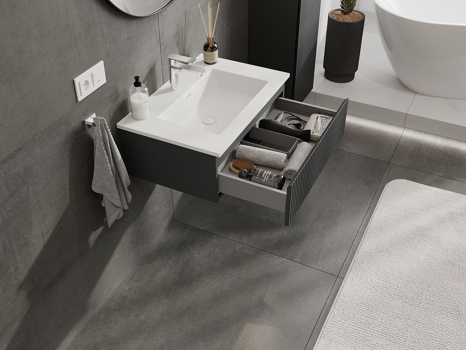 Mexen Rivel kúpeľňová skrinka 70 cm s umývadlom Otis, 1 zásuvka, ryhovaná, grafit matná/biela matná - 91A20-07023-1-BF66-W18M01
