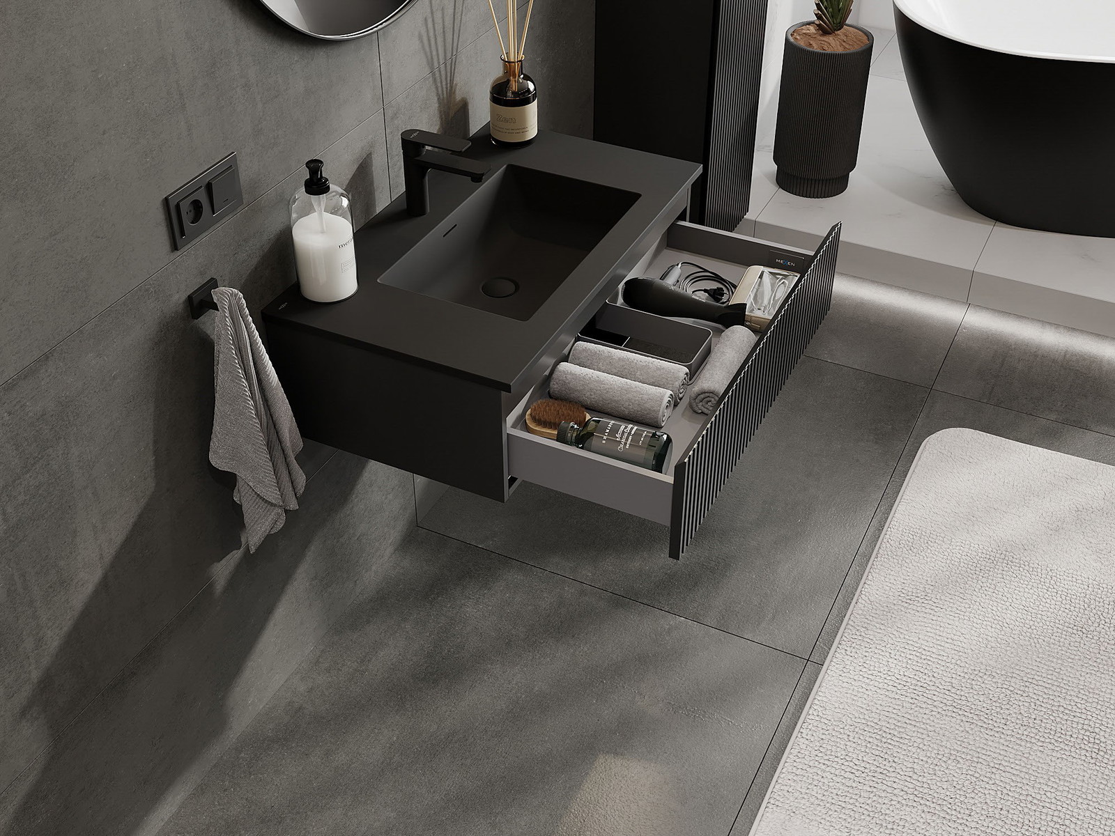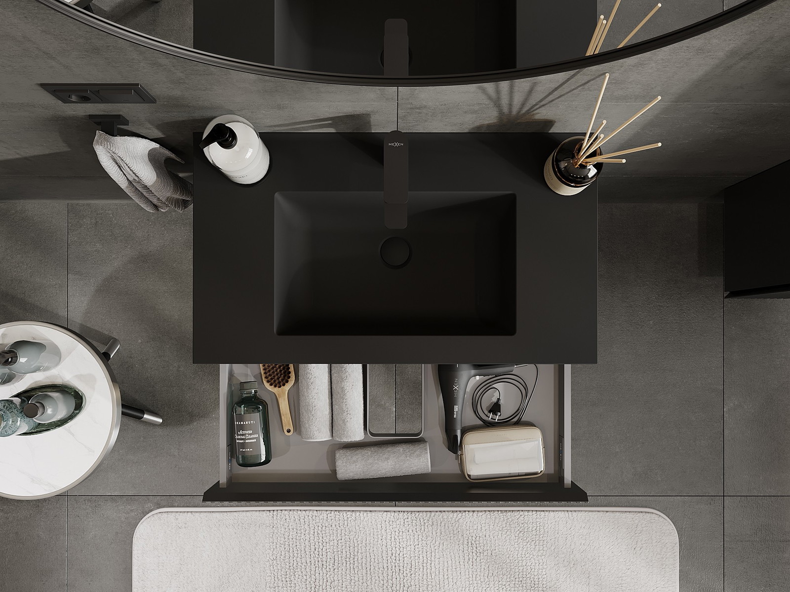 Mexen Rivel kúpeľňová skrinka 80 cm s umývadlom Otis, 1 zásuvka, ryhovaná, čierna matná - 91A20-08023-1-BF71-W18M71