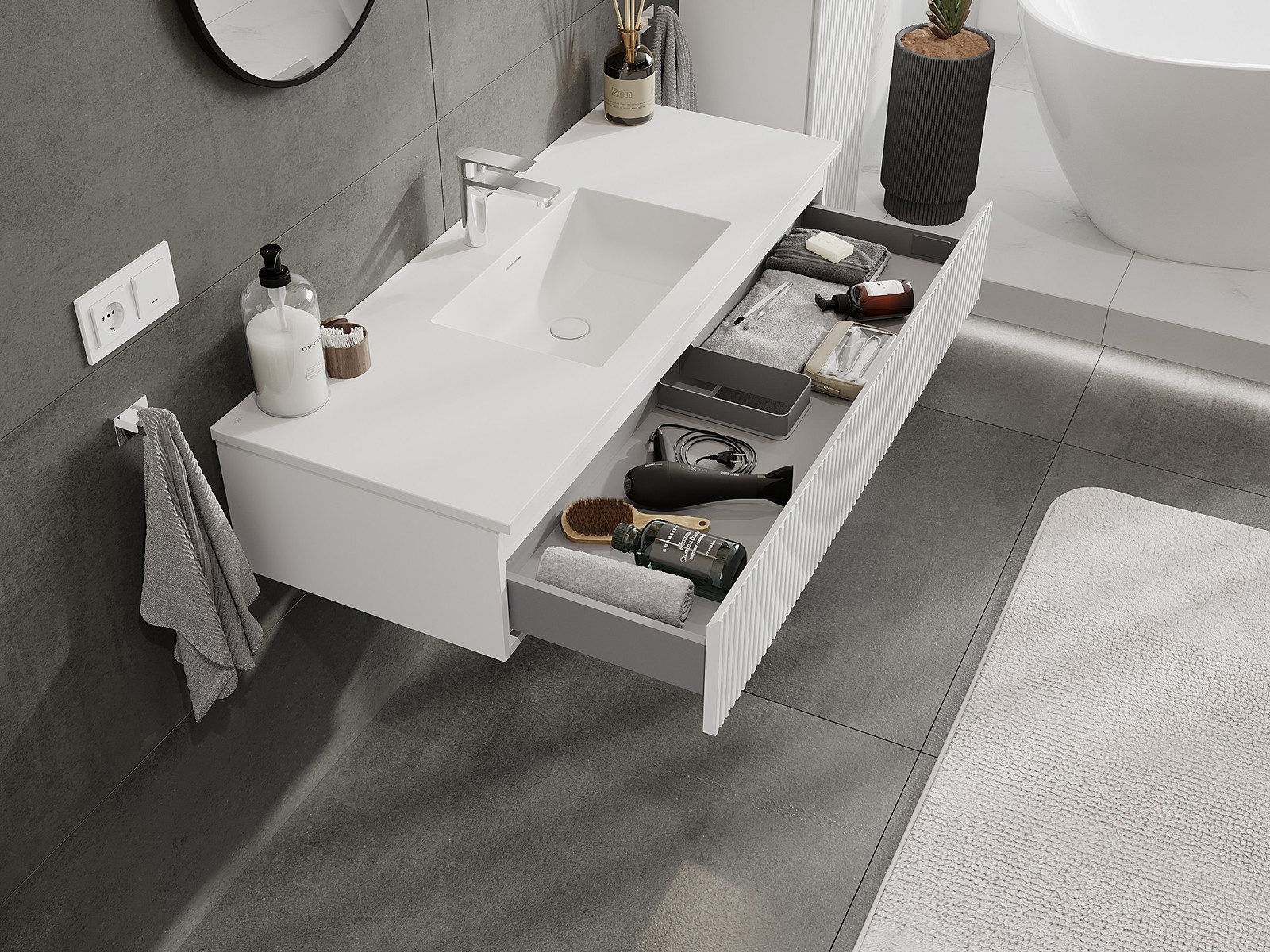 Výrez v zásuvke je navrhnutý tak, aby pojal sifón, ktorý je nevyhnutný v umývadlových inštaláciách. Vďaka tomu môže byť nábytok namontovaný plne funkčne, bez nutnosti vzdávať sa priestoru v zásuvke v prospech inštalácie.