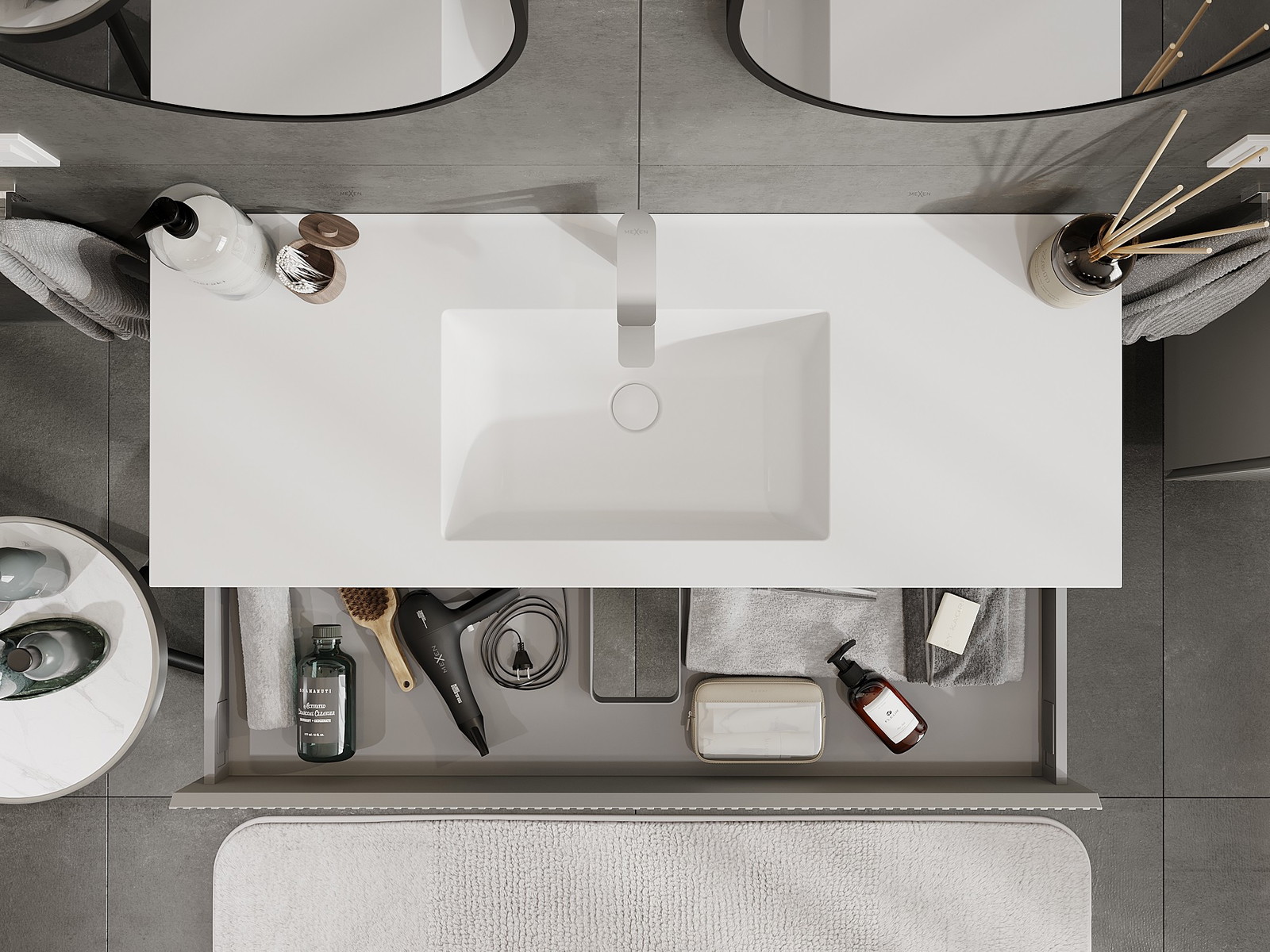 Výrez v zásuvke je navrhnutý tak, aby pojal sifón, ktorý je nevyhnutný v umývadlových inštaláciách. Vďaka tomu môže byť nábytok namontovaný plne funkčne, bez nutnosti vzdávať sa priestoru v zásuvke v prospech inštalácie.