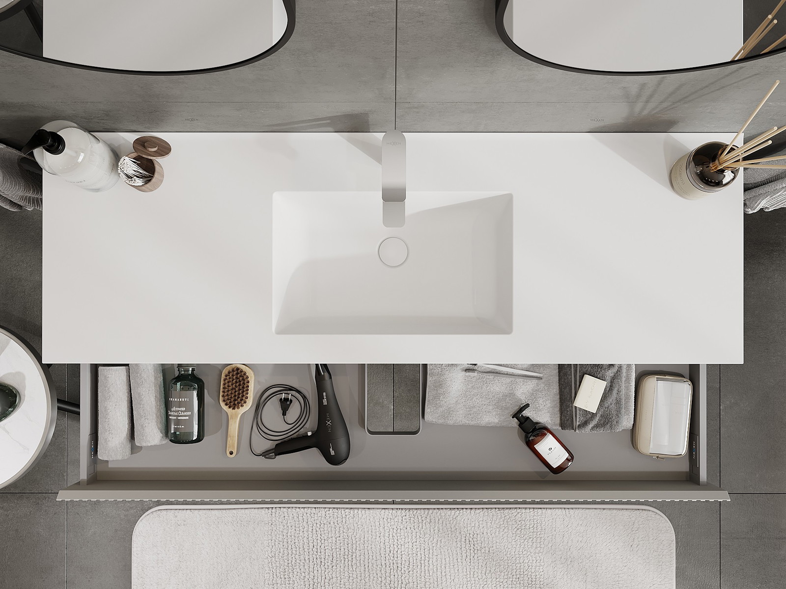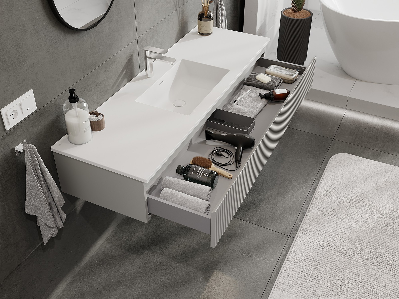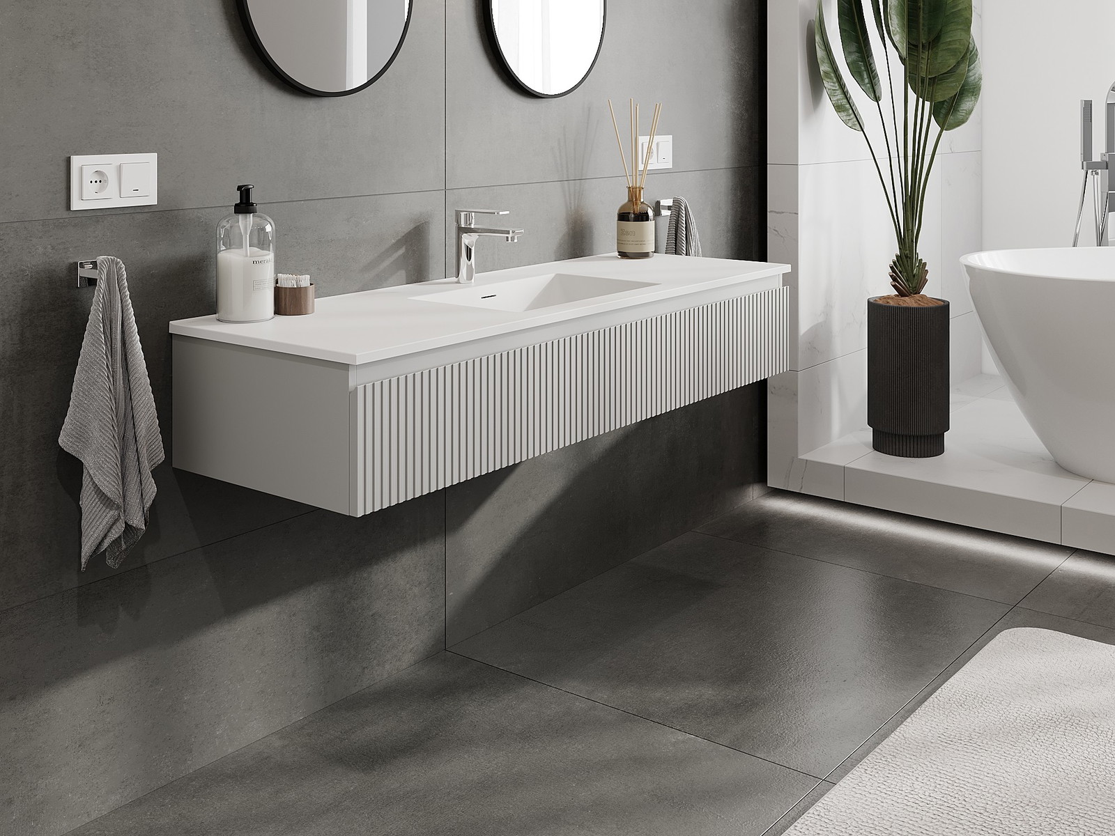 Mexen Rivel kúpeľňová skrinka 140 cm s umývadlom Otis, 1 zásuvka, ryhovaná, sivá matná/biela matná - 91A20-14023-1-BF62-W18M01