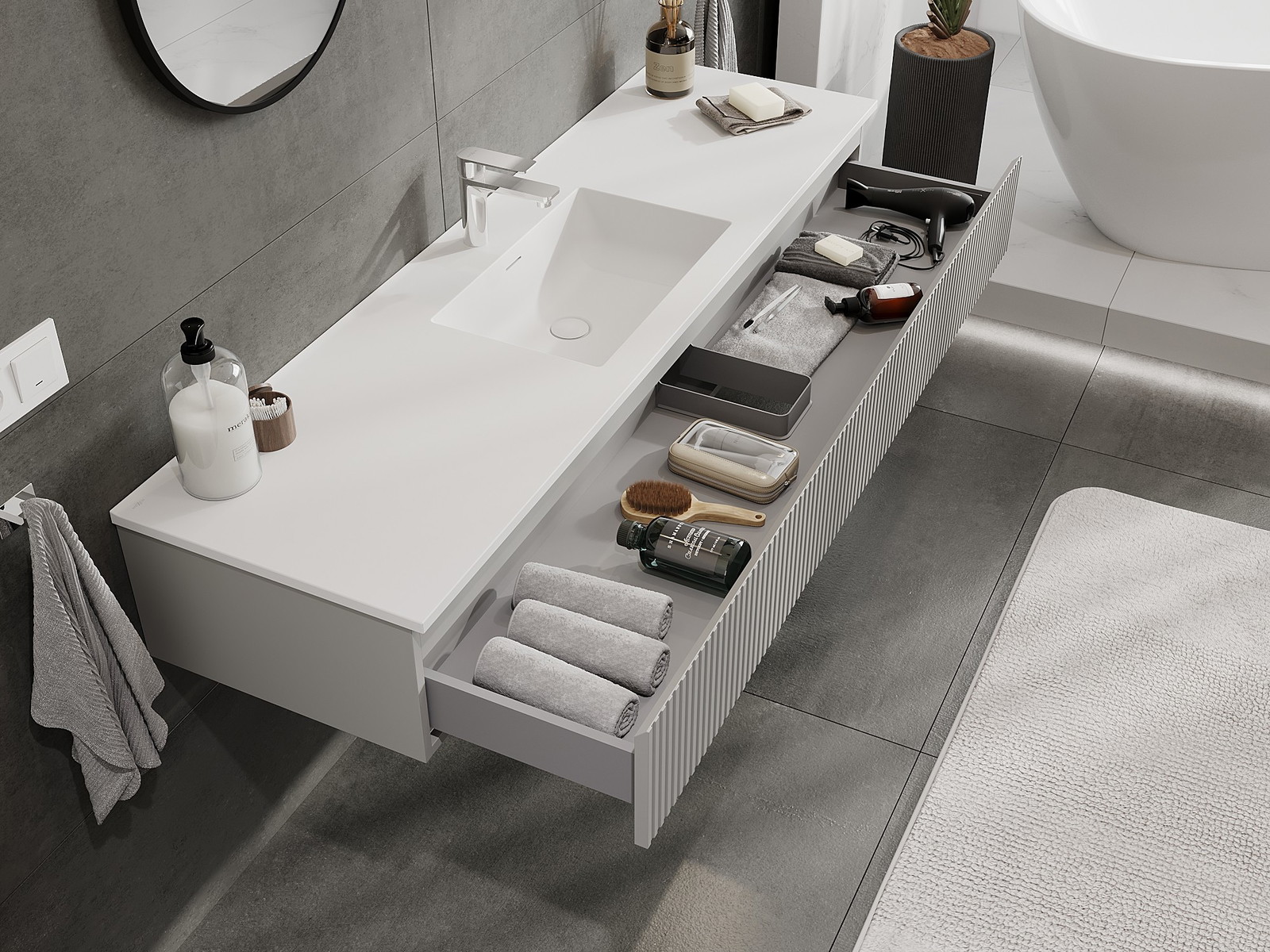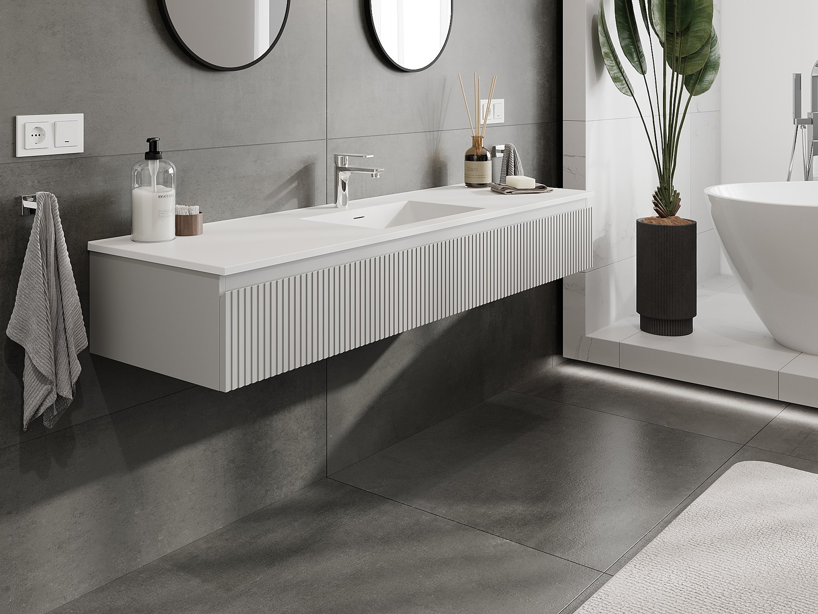 Mexen Rivel kúpeľňová skrinka 160 cm s umývadlom Otis, 1 zásuvka, ryhovaná, sivá matná/biela matná - 91A20-16023-1-BF62-W18M01