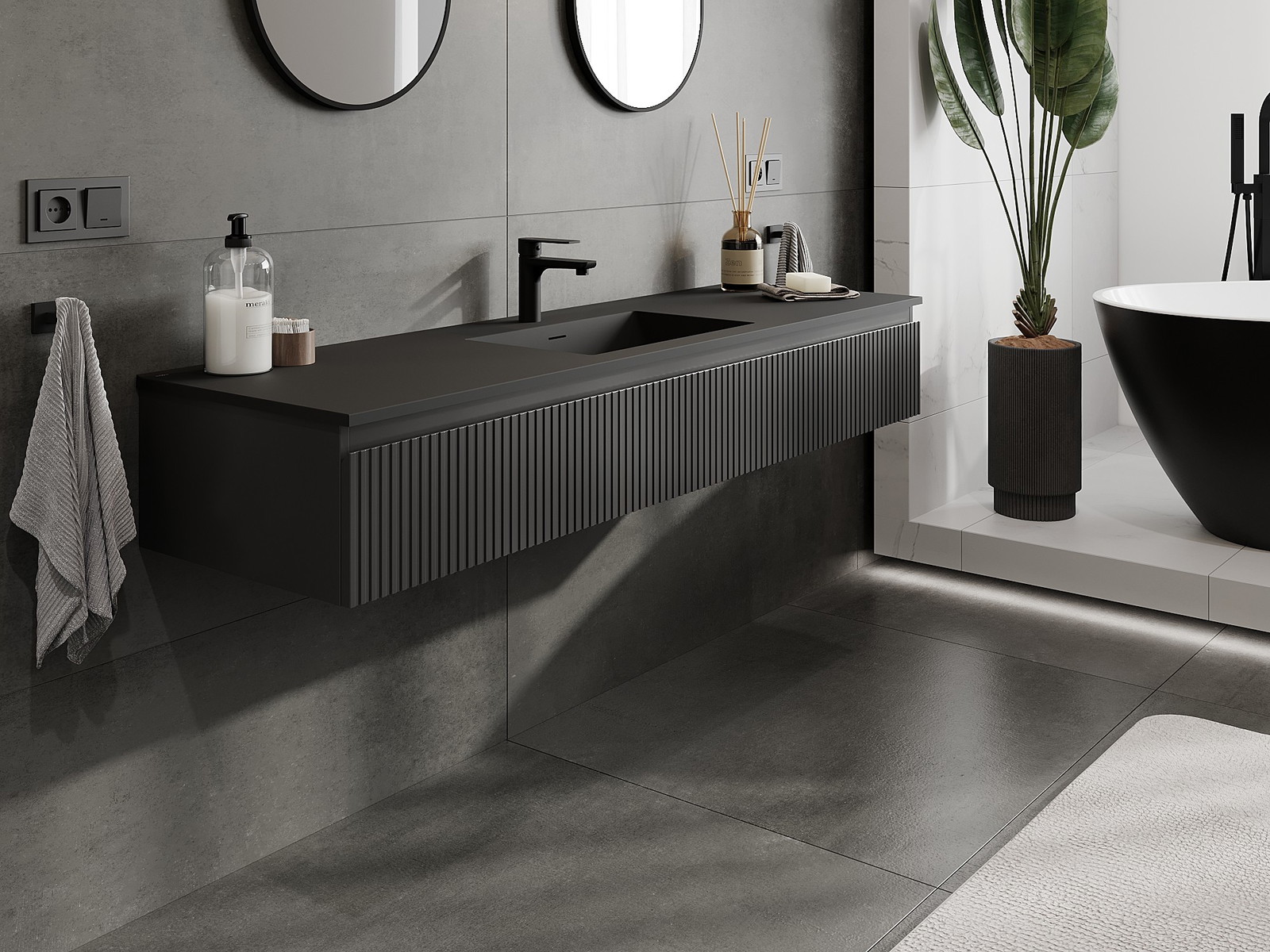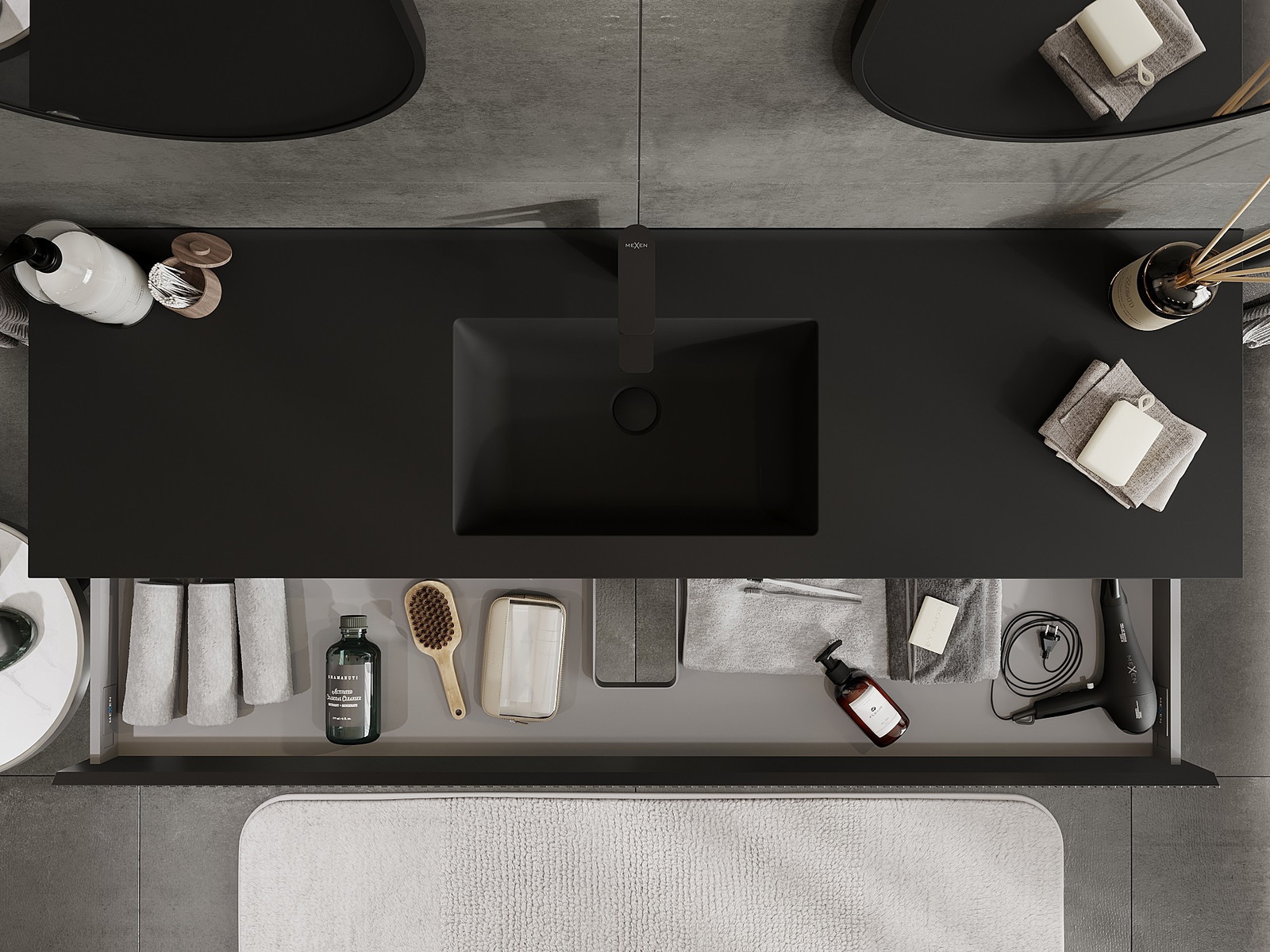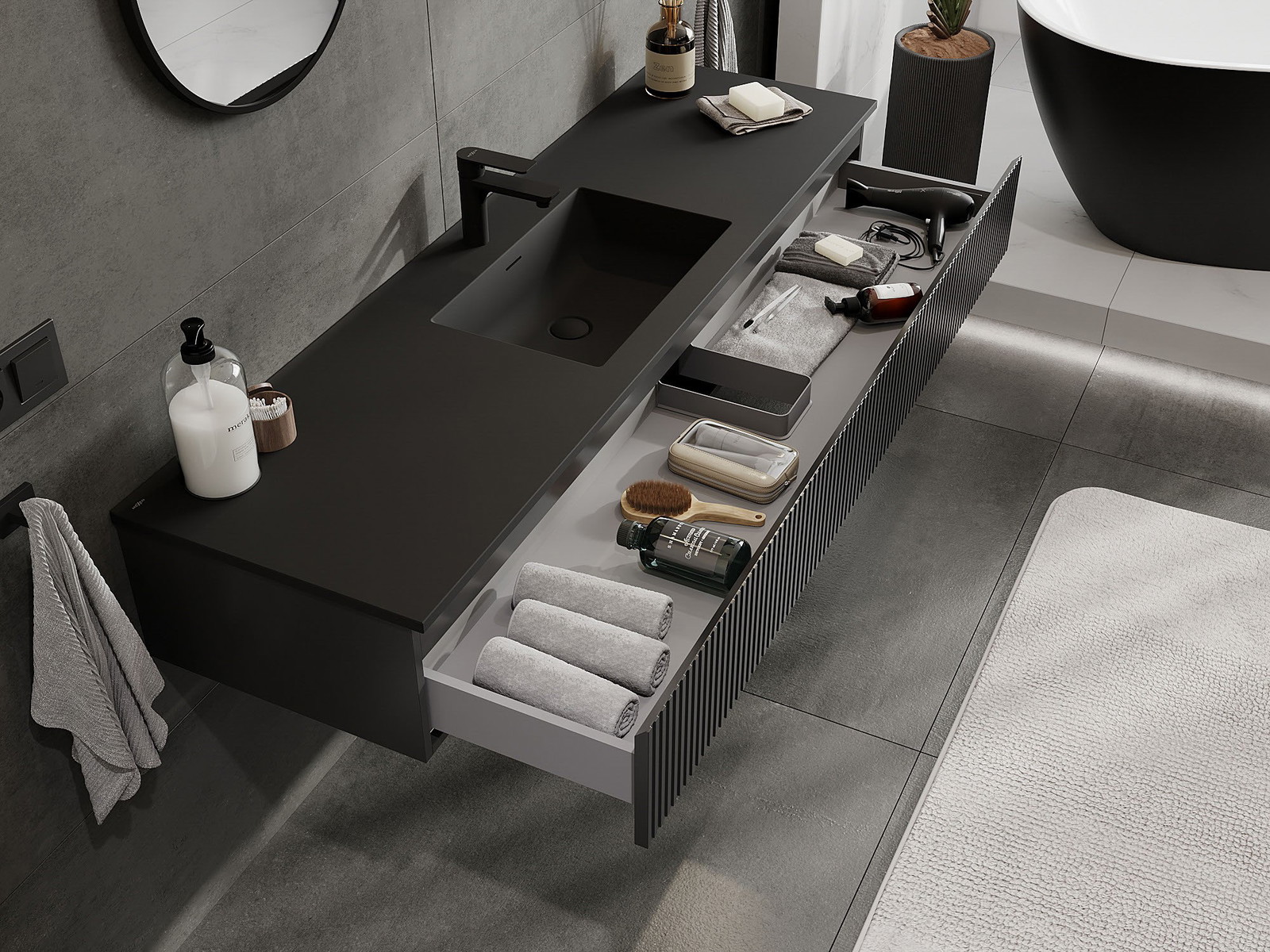 Mexen Rivel kúpeľňová skrinka 160 cm s umývadlom Otis, 1 zásuvka, ryhovaná, čierna matná - 91A20-16023-1-BF71-W18M71