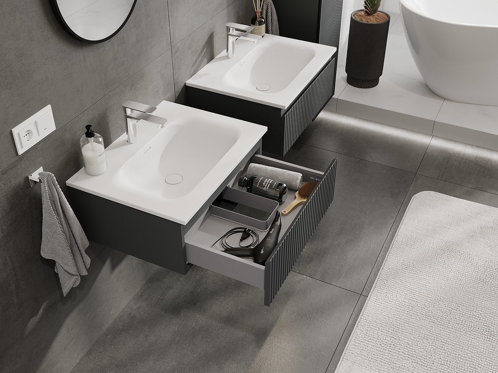 Výrez v zásuvke je navrhnutý tak, aby pojal sifón, ktorý je nevyhnutný v umývadlových inštaláciách. Vďaka tomu môže byť nábytok namontovaný plne funkčne, bez nutnosti vzdávať sa priestoru v zásuvke v prospech inštalácie.