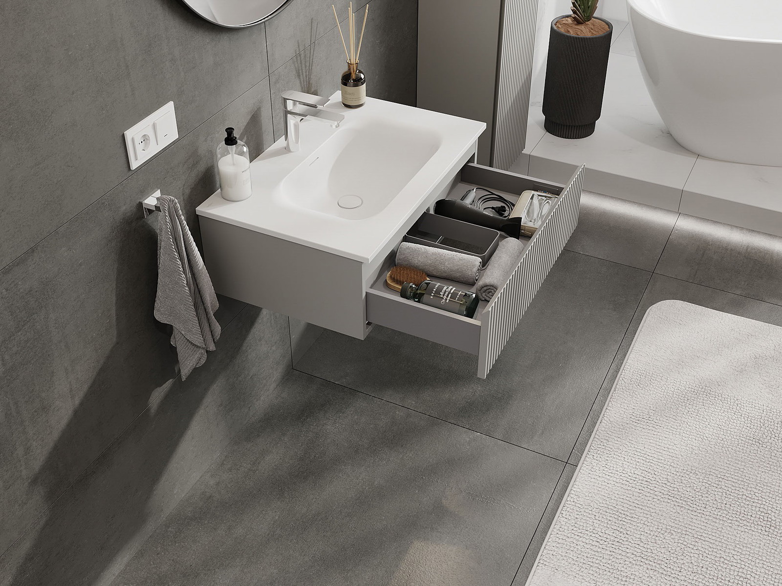 Výrez v zásuvke je navrhnutý tak, aby pojal sifón, ktorý je nevyhnutný v umývadlových inštaláciách. Vďaka tomu môže byť nábytok namontovaný plne funkčne, bez nutnosti vzdávať sa priestoru v zásuvke v prospech inštalácie.