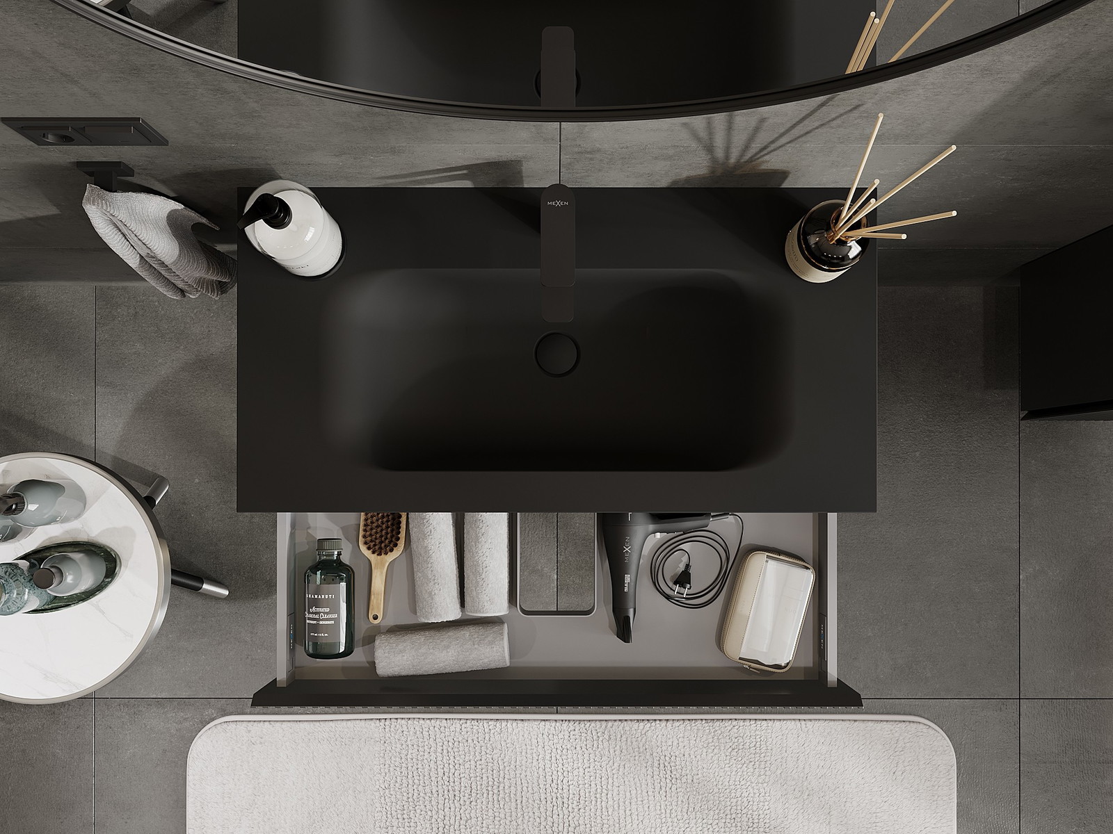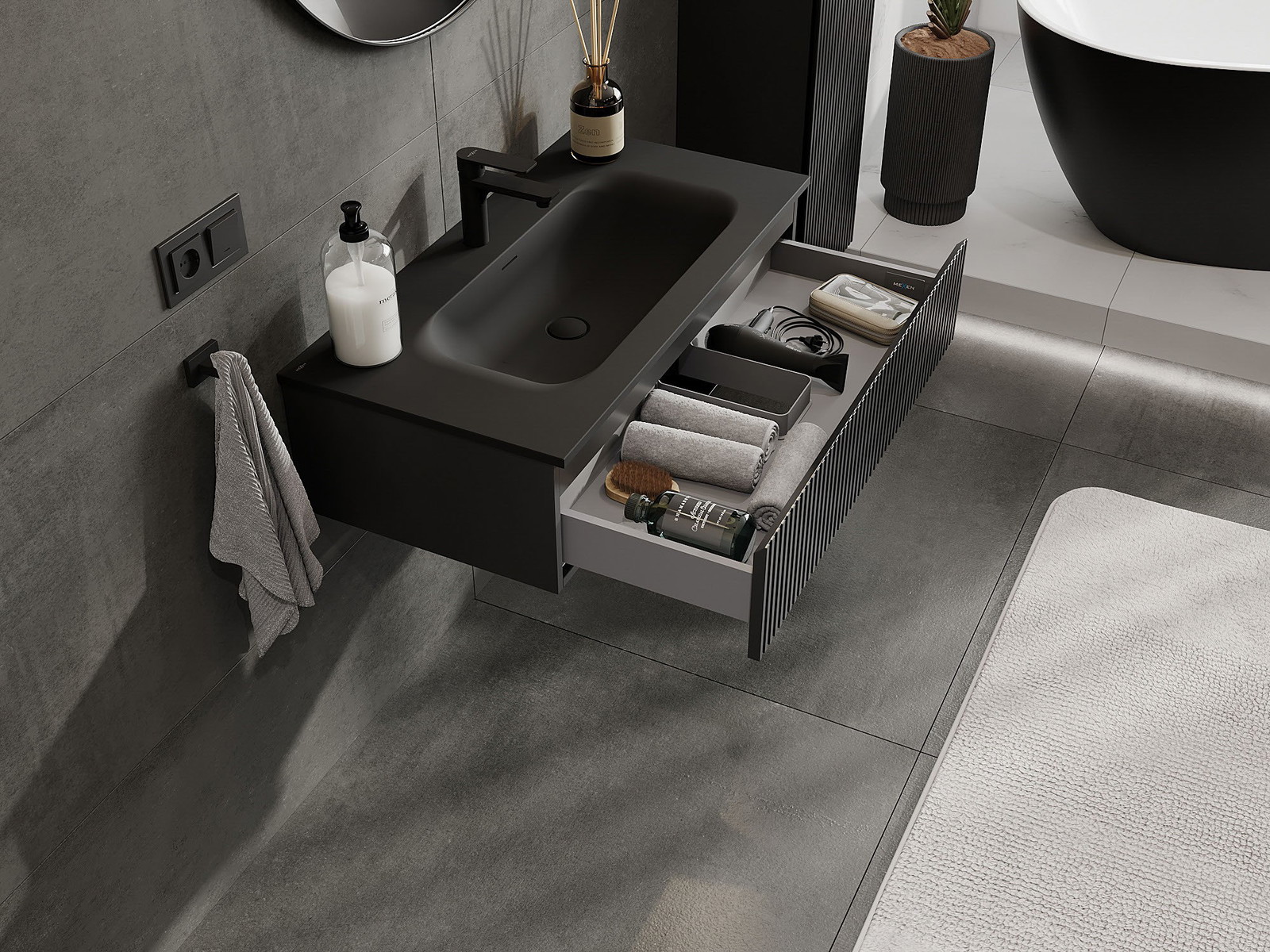 Výrez v zásuvke je navrhnutý tak, aby pojal sifón, ktorý je nevyhnutný v umývadlových inštaláciách. Vďaka tomu môže byť nábytok namontovaný plne funkčne, bez nutnosti vzdávať sa priestoru v zásuvke v prospech inštalácie.