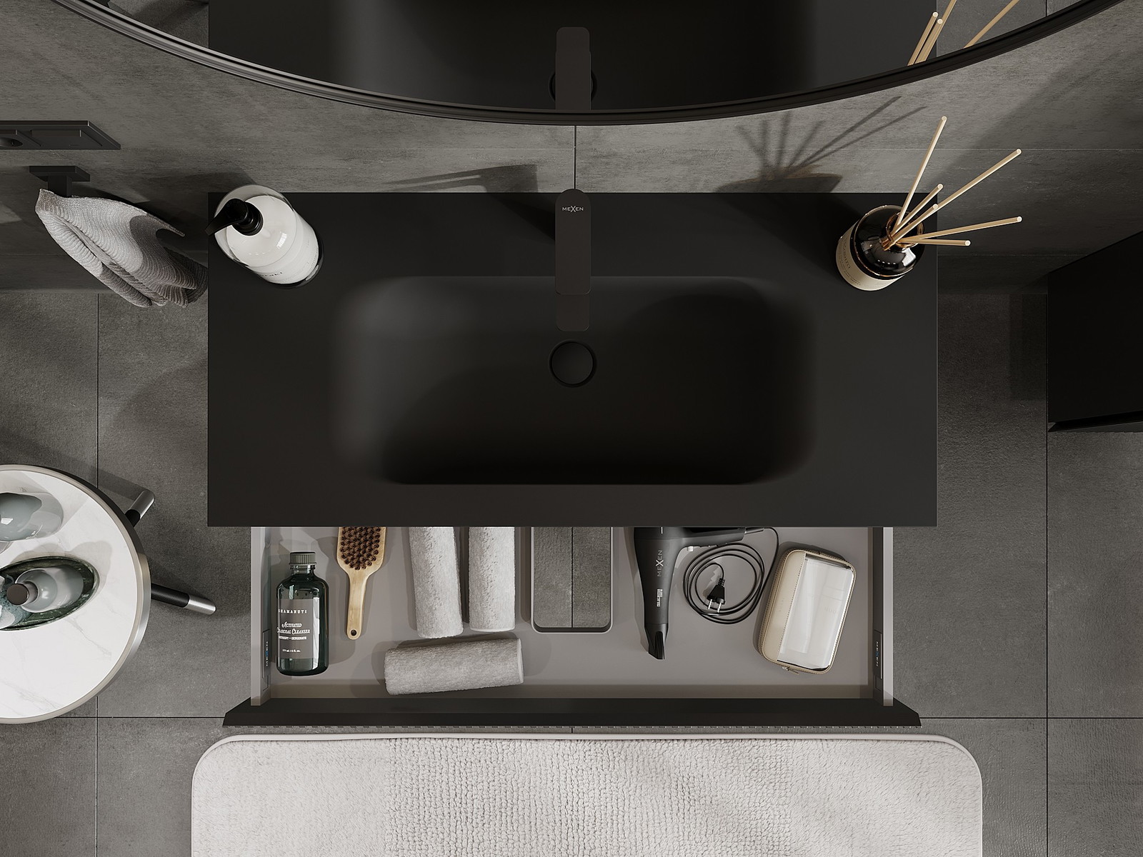 Výrez v zásuvke je navrhnutý tak, aby pojal sifón, ktorý je nevyhnutný v umývadlových inštaláciách. Vďaka tomu môže byť nábytok namontovaný plne funkčne, bez nutnosti vzdávať sa priestoru v zásuvke v prospech inštalácie.