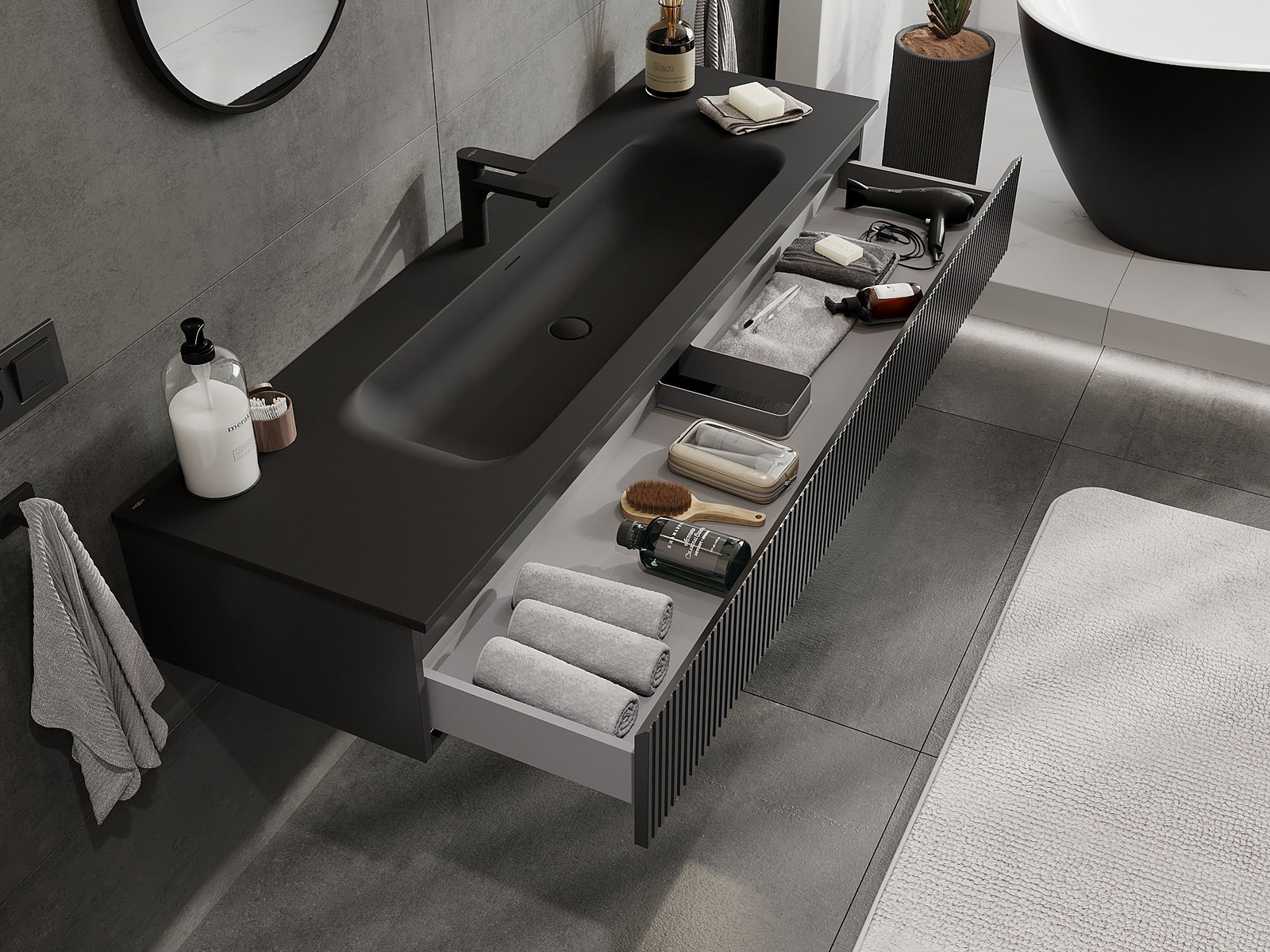 Výrez v zásuvke je navrhnutý tak, aby pojal sifón, ktorý je nevyhnutný v umývadlových inštaláciách. Vďaka tomu môže byť nábytok namontovaný plne funkčne, bez nutnosti vzdávať sa priestoru v zásuvke v prospech inštalácie.
