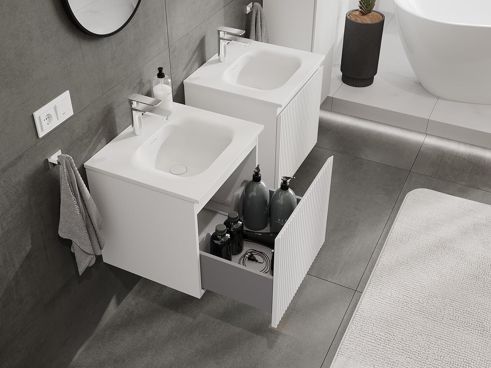 Naše modulárne kúpeľňové nábytkové prvky možno kombinovať v rôznych farebných konfiguráciách, čo umožňuje úplnú personalizáciu. Môžete si vybrať vzhľad aj funkcie jednotlivých prvkov, čo umožňuje prispôsobiť nábytok vašim vlastným štýlovým a používateľským preferenciám.