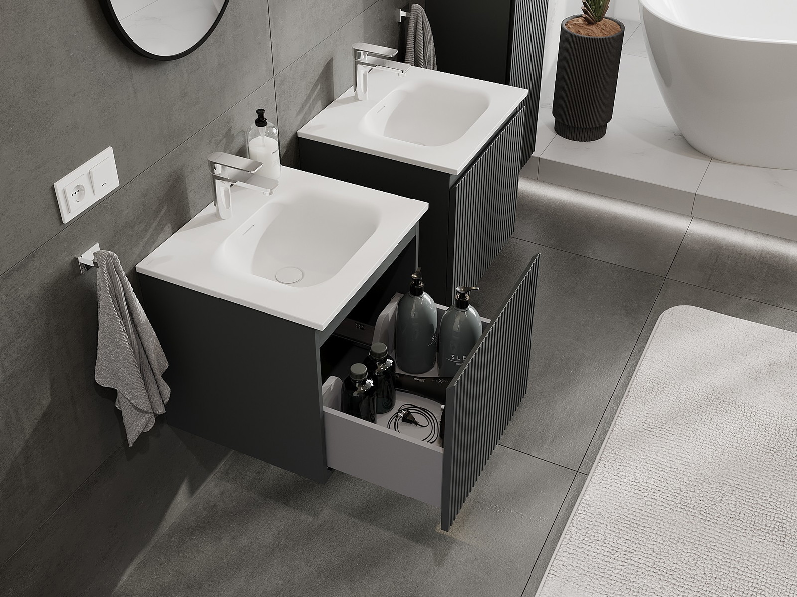 Výrez v zásuvke je navrhnutý tak, aby pojal sifón, ktorý je nevyhnutný v umývadlových inštaláciách. Vďaka tomu môže byť nábytok namontovaný plne funkčne, bez nutnosti vzdávať sa priestoru v zásuvke v prospech inštalácie.