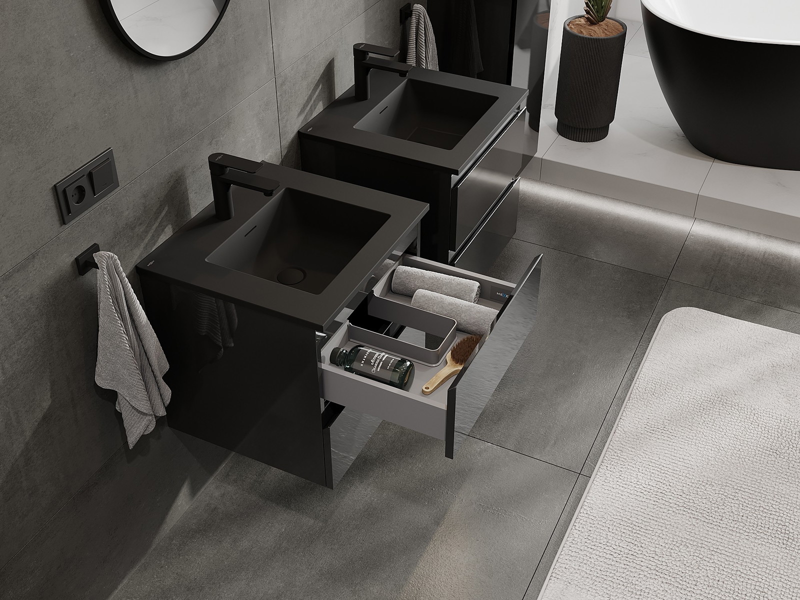 Výrez v zásuvke je navrhnutý tak, aby pojal sifón, ktorý je nevyhnutný v umývadlových inštaláciách. Vďaka tomu môže byť nábytok namontovaný plne funkčne, bez nutnosti vzdávať sa priestoru v zásuvke v prospech inštalácie.