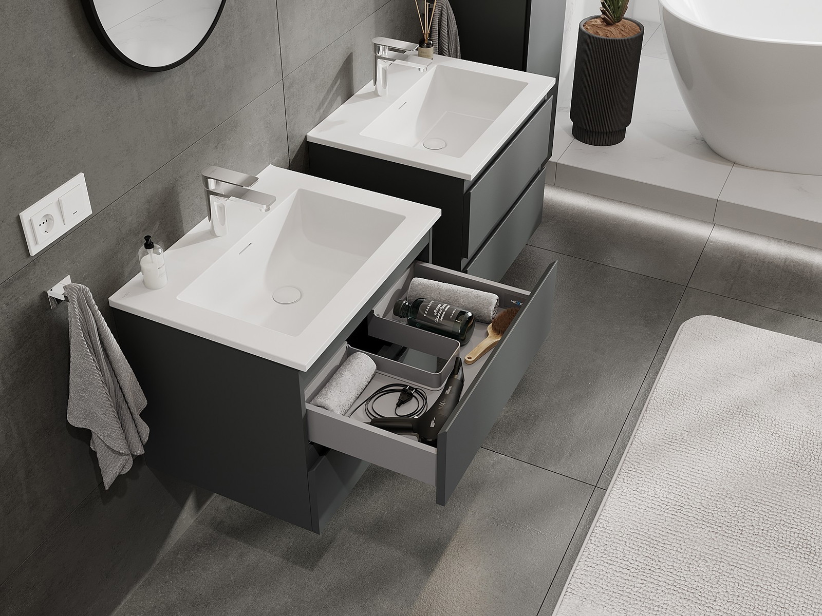Výrez v zásuvke je navrhnutý tak, aby pojal sifón, ktorý je nevyhnutný v umývadlových inštaláciách. Vďaka tomu môže byť nábytok namontovaný plne funkčne, bez nutnosti vzdávať sa priestoru v zásuvke v prospech inštalácie.
