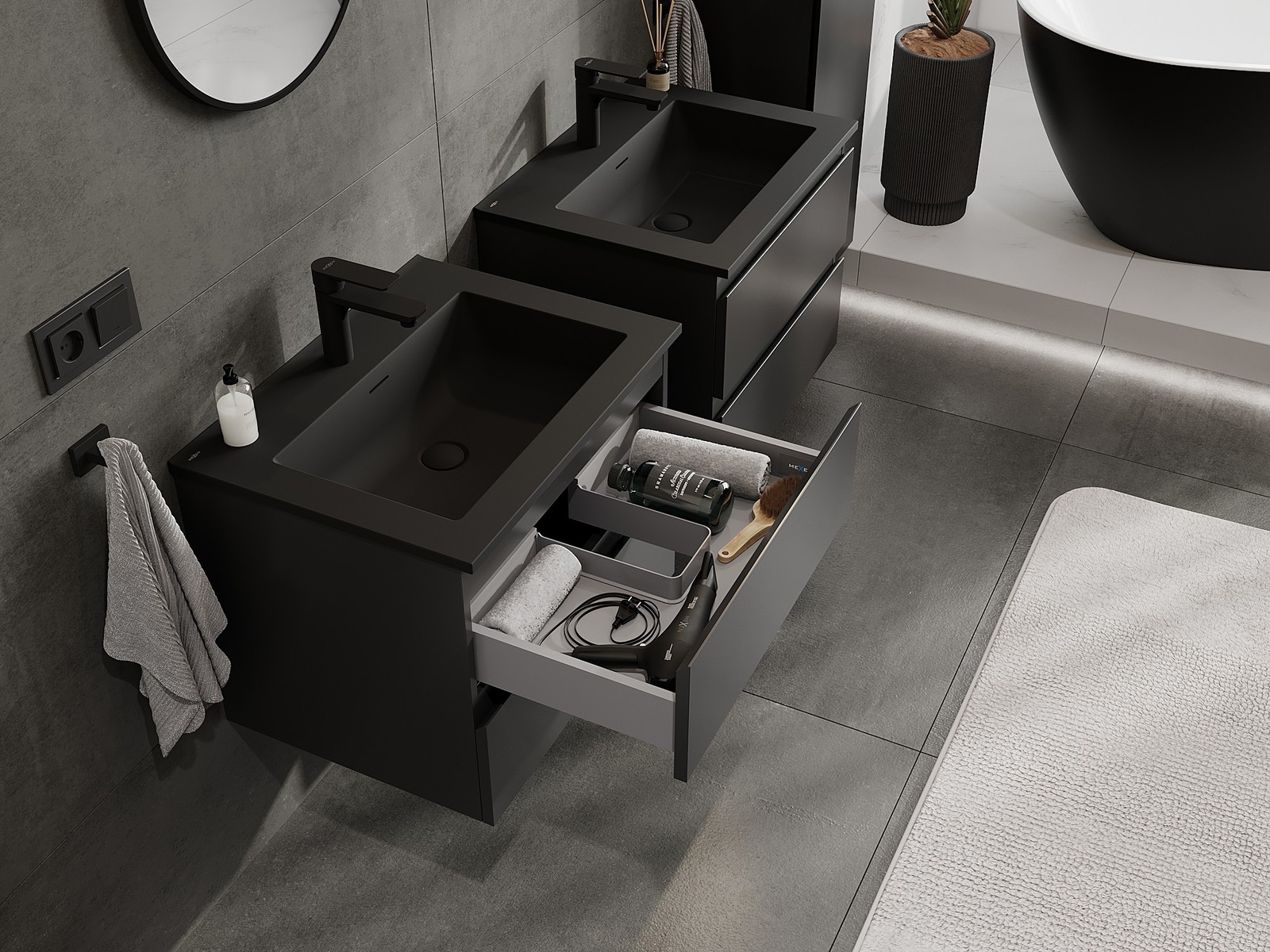 Výrez v zásuvke je navrhnutý tak, aby pojal sifón, ktorý je nevyhnutný v umývadlových inštaláciách. Vďaka tomu môže byť nábytok namontovaný plne funkčne, bez nutnosti vzdávať sa priestoru v zásuvke v prospech inštalácie.