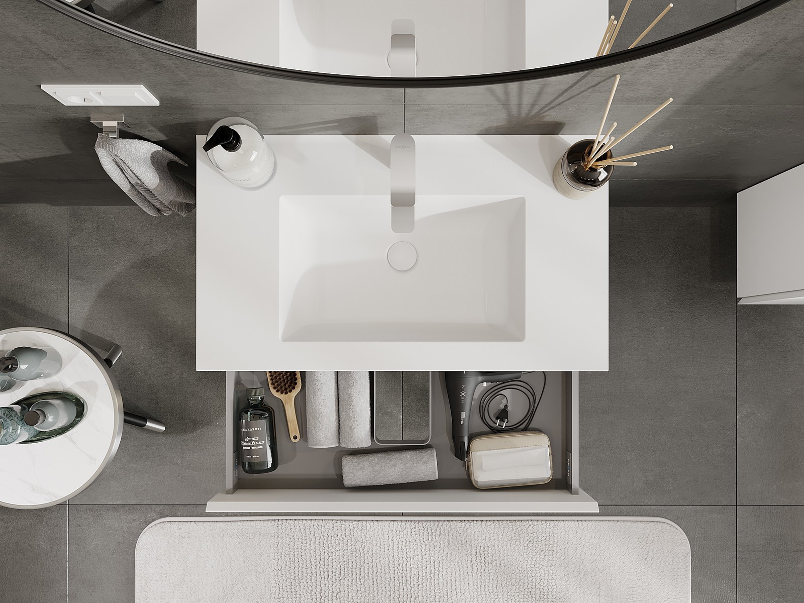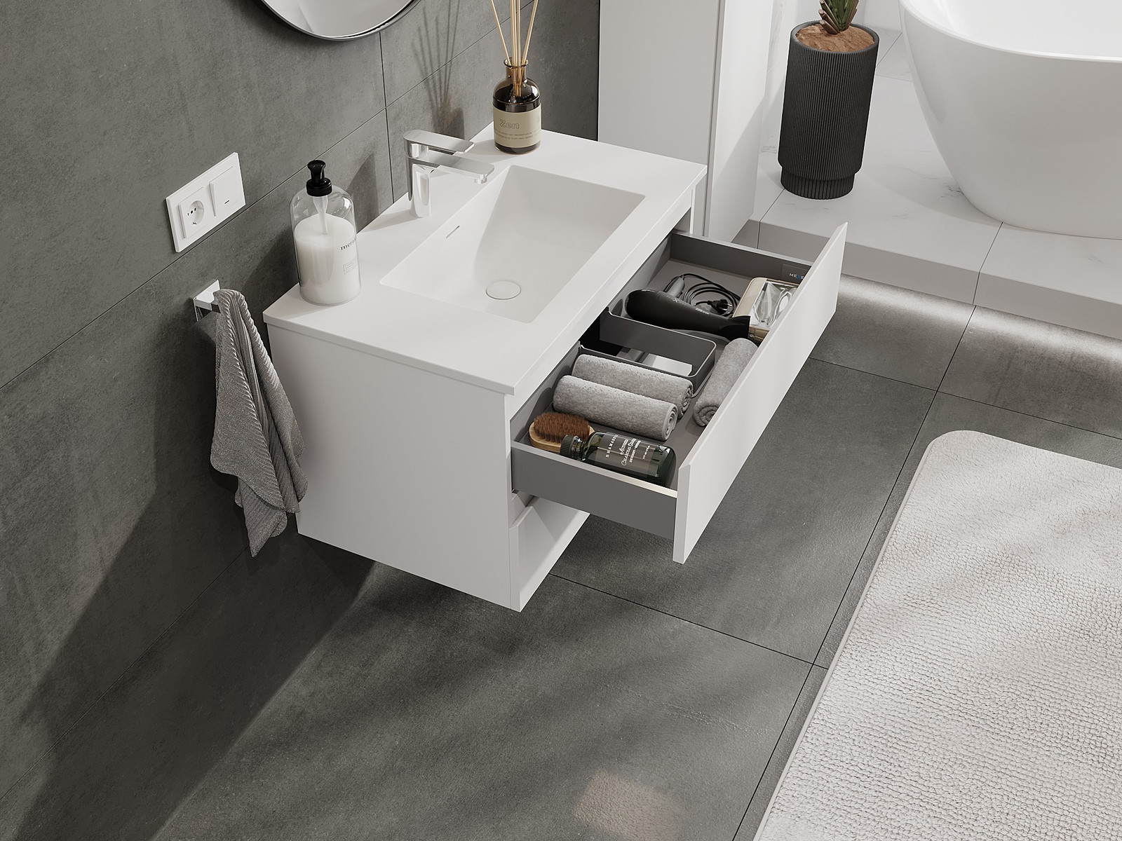 Výrez v zásuvke je navrhnutý tak, aby pojal sifón, ktorý je nevyhnutný v umývadlových inštaláciách. Vďaka tomu môže byť nábytok namontovaný plne funkčne, bez nutnosti vzdávať sa priestoru v zásuvke v prospech inštalácie.