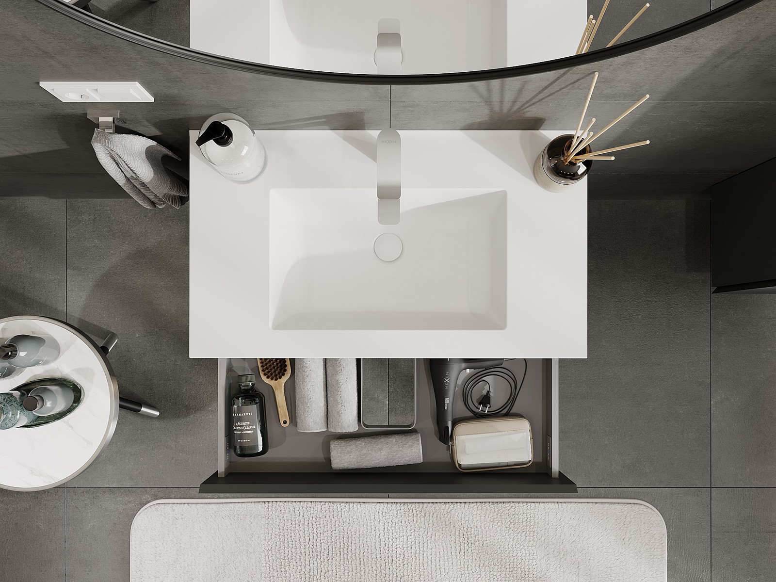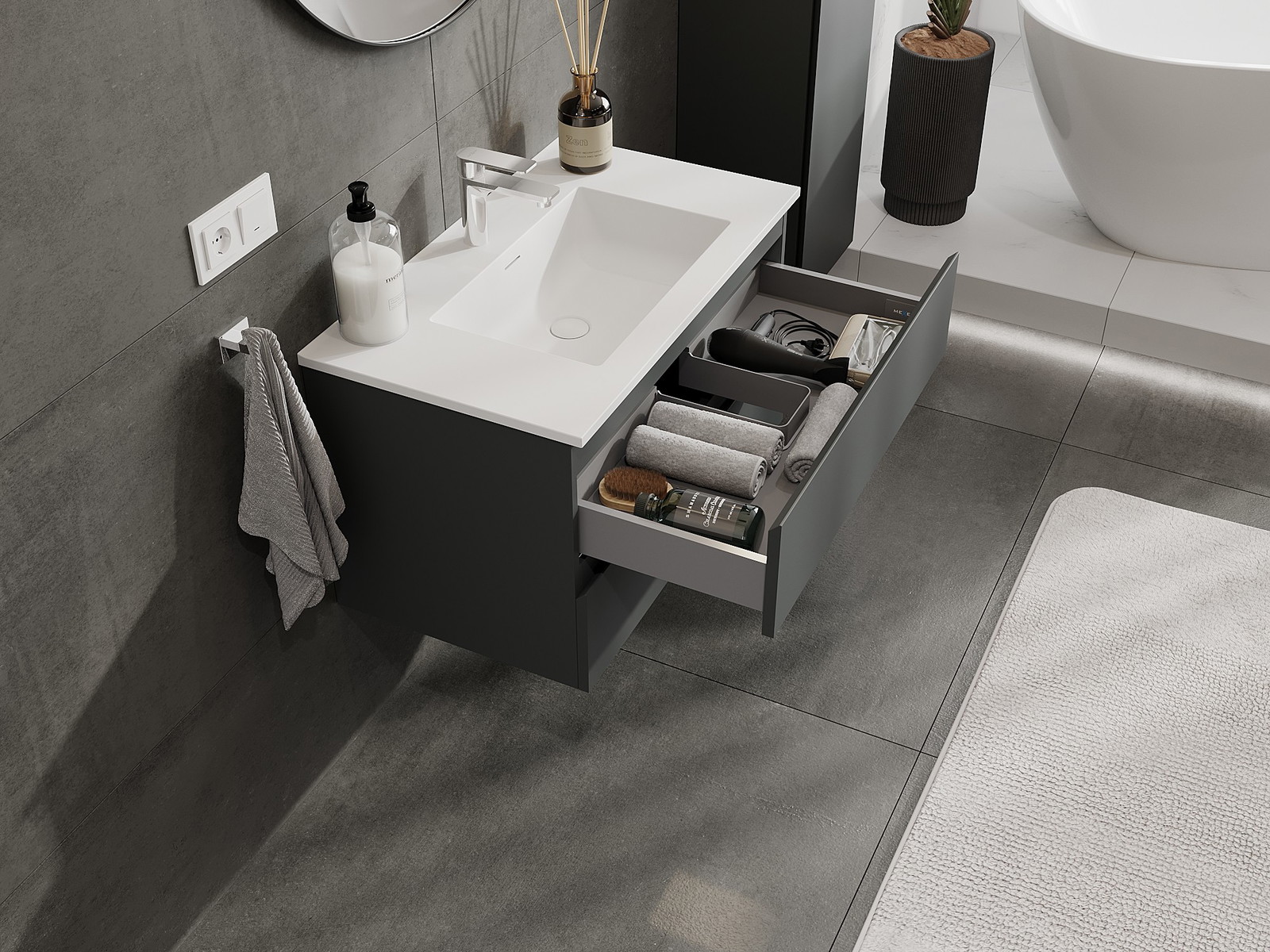Výrez v zásuvke je navrhnutý tak, aby pojal sifón, ktorý je nevyhnutný v umývadlových inštaláciách. Vďaka tomu môže byť nábytok namontovaný plne funkčne, bez nutnosti vzdávať sa priestoru v zásuvke v prospech inštalácie.
