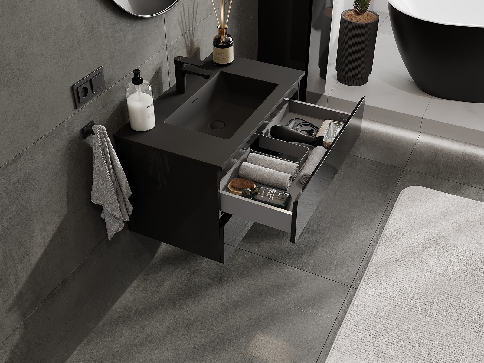Výrez v zásuvke je navrhnutý tak, aby pojal sifón, ktorý je nevyhnutný v umývadlových inštaláciách. Vďaka tomu môže byť nábytok namontovaný plne funkčne, bez nutnosti vzdávať sa priestoru v zásuvke v prospech inštalácie.