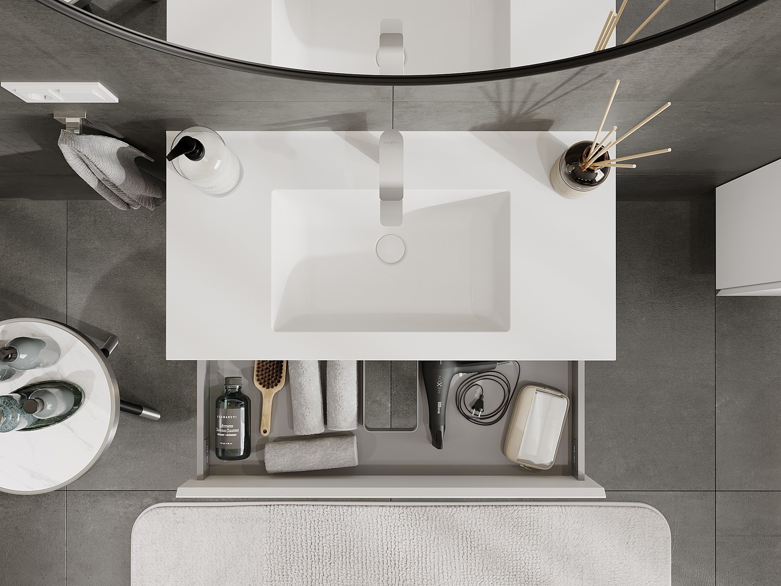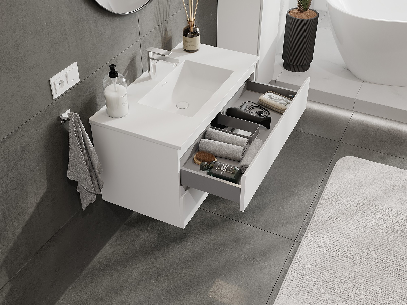 Výrez v zásuvke je navrhnutý tak, aby pojal sifón, ktorý je nevyhnutný v umývadlových inštaláciách. Vďaka tomu môže byť nábytok namontovaný plne funkčne, bez nutnosti vzdávať sa priestoru v zásuvke v prospech inštalácie.