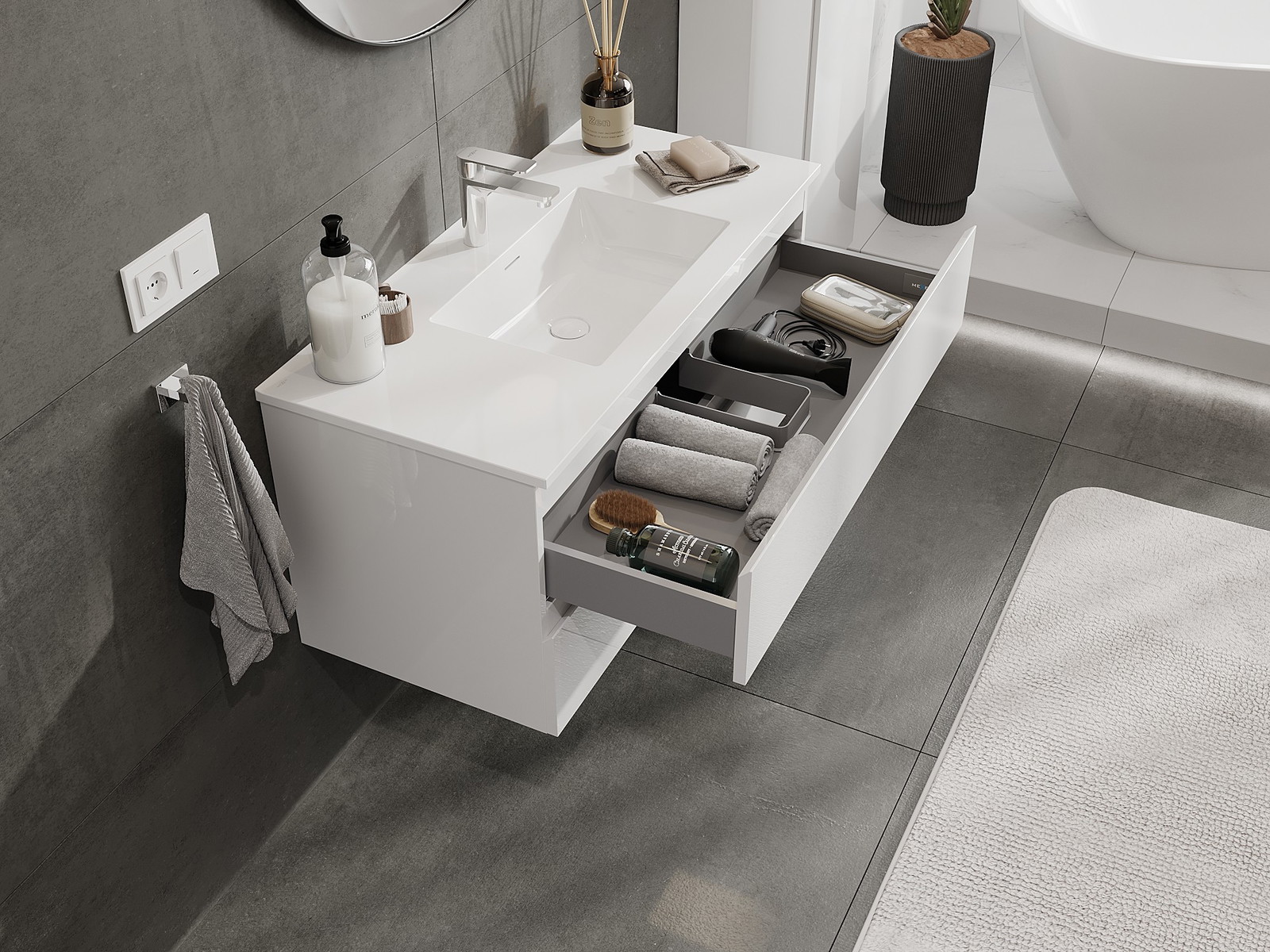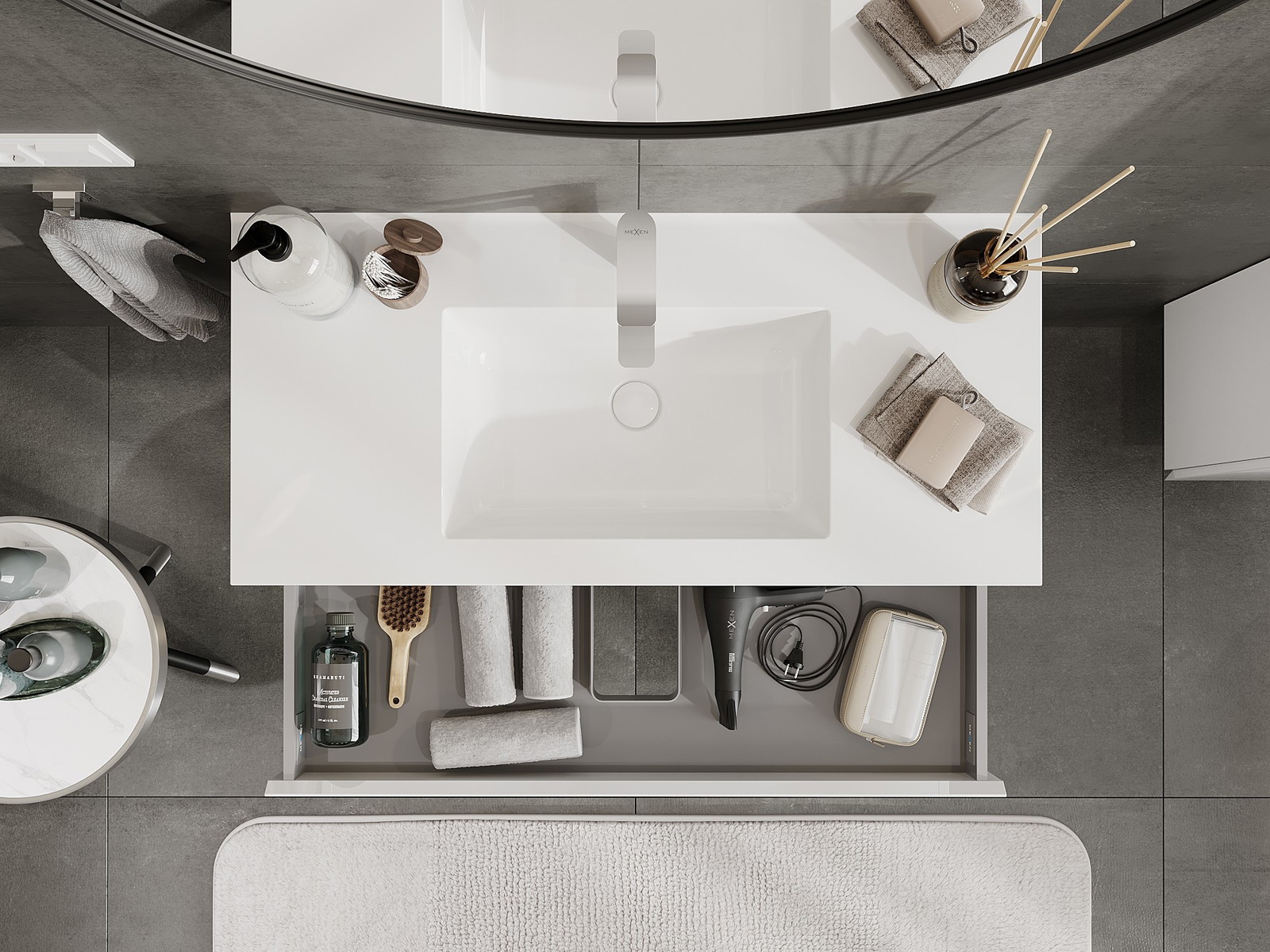 Výrez v zásuvke je navrhnutý tak, aby pojal sifón, ktorý je nevyhnutný v umývadlových inštaláciách. Vďaka tomu môže byť nábytok namontovaný plne funkčne, bez nutnosti vzdávať sa priestoru v zásuvke v prospech inštalácie.