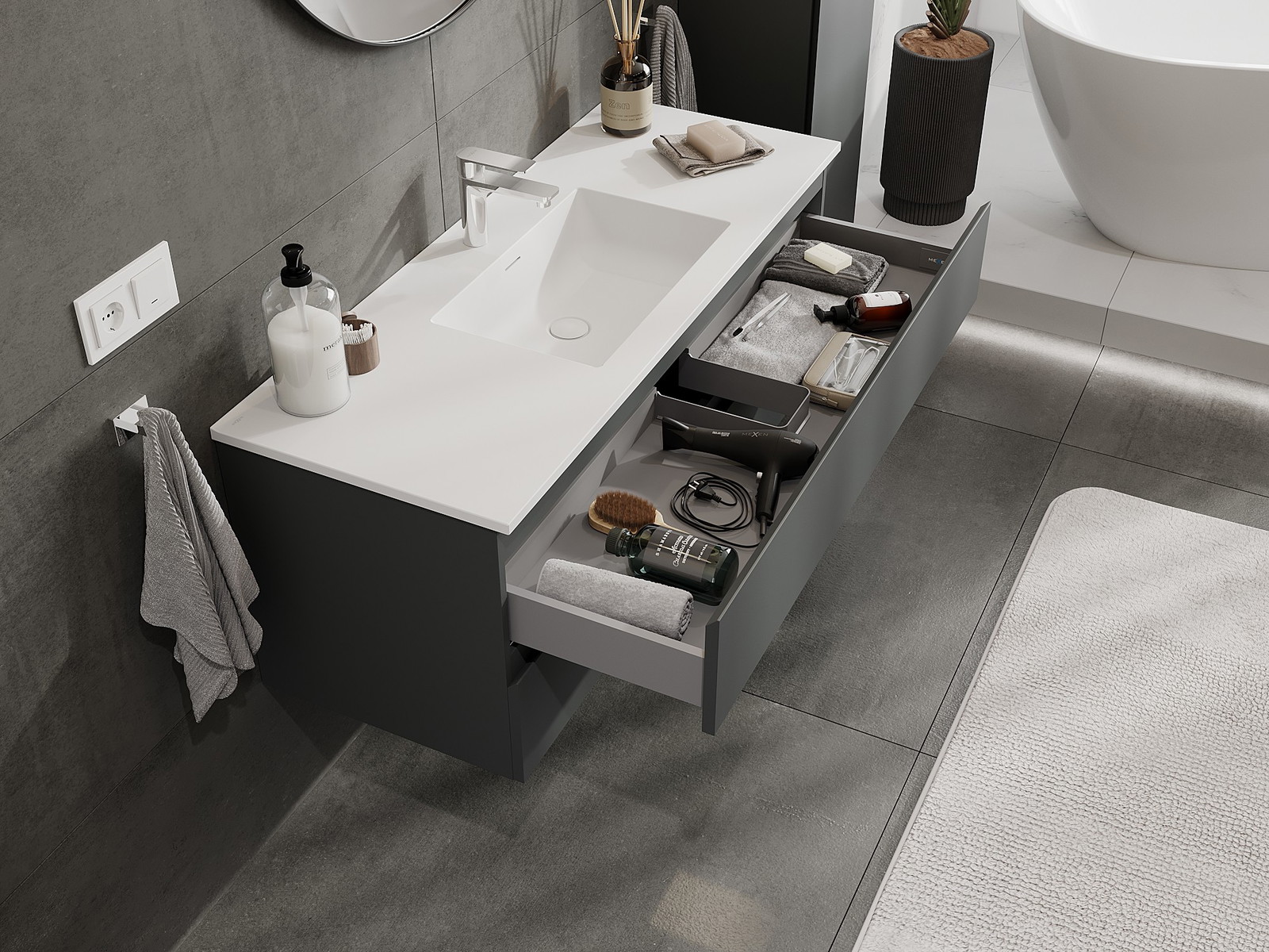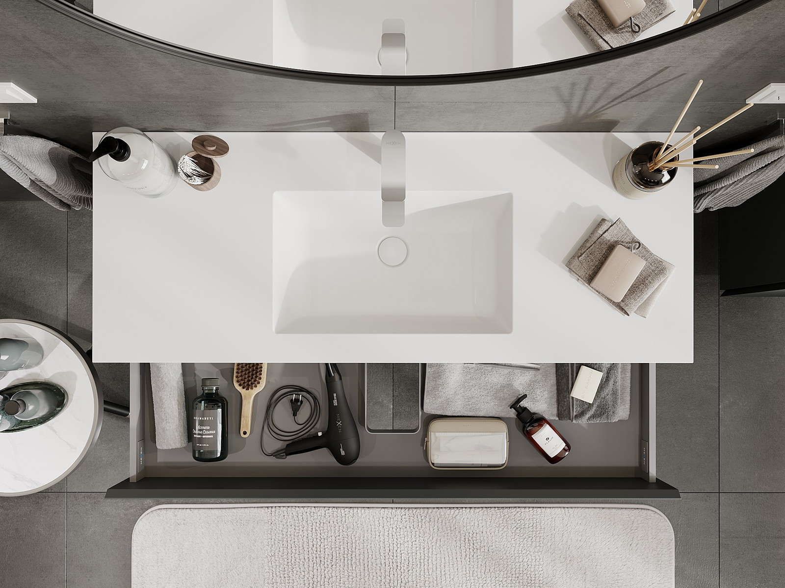 Výrez v zásuvke je navrhnutý tak, aby pojal sifón, ktorý je nevyhnutný v umývadlových inštaláciách. Vďaka tomu môže byť nábytok namontovaný plne funkčne, bez nutnosti vzdávať sa priestoru v zásuvke v prospech inštalácie.