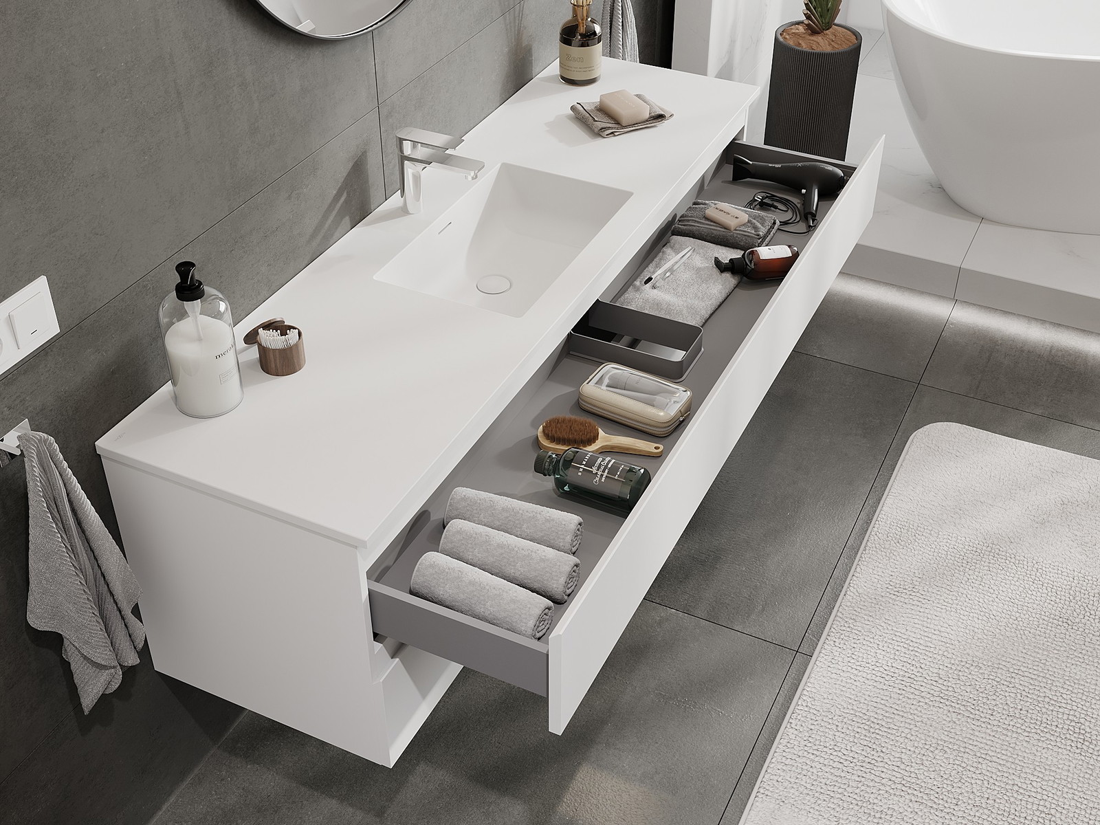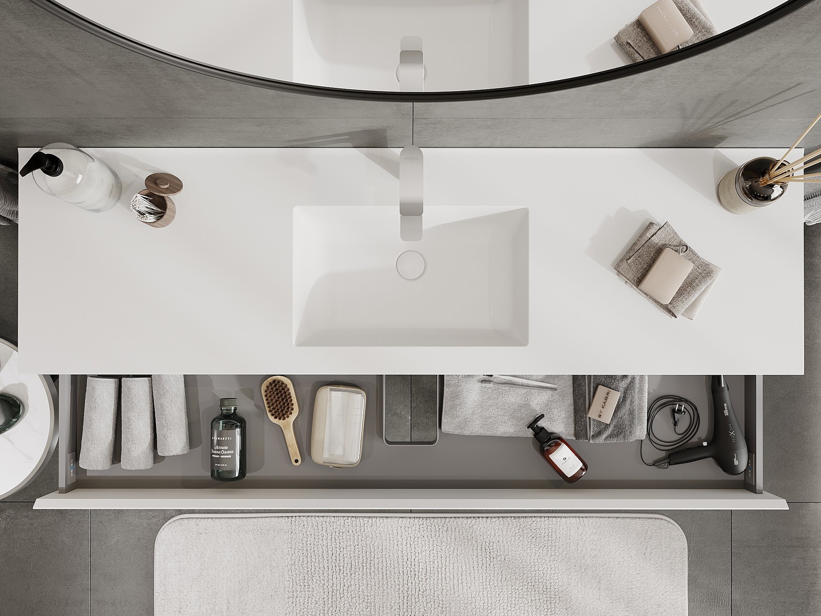 Výrez v zásuvke je navrhnutý tak, aby pojal sifón, ktorý je nevyhnutný v umývadlových inštaláciách. Vďaka tomu môže byť nábytok namontovaný plne funkčne, bez nutnosti vzdávať sa priestoru v zásuvke v prospech inštalácie.