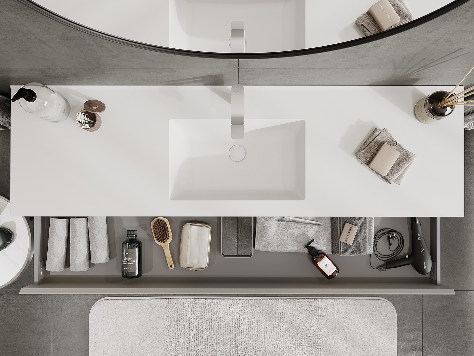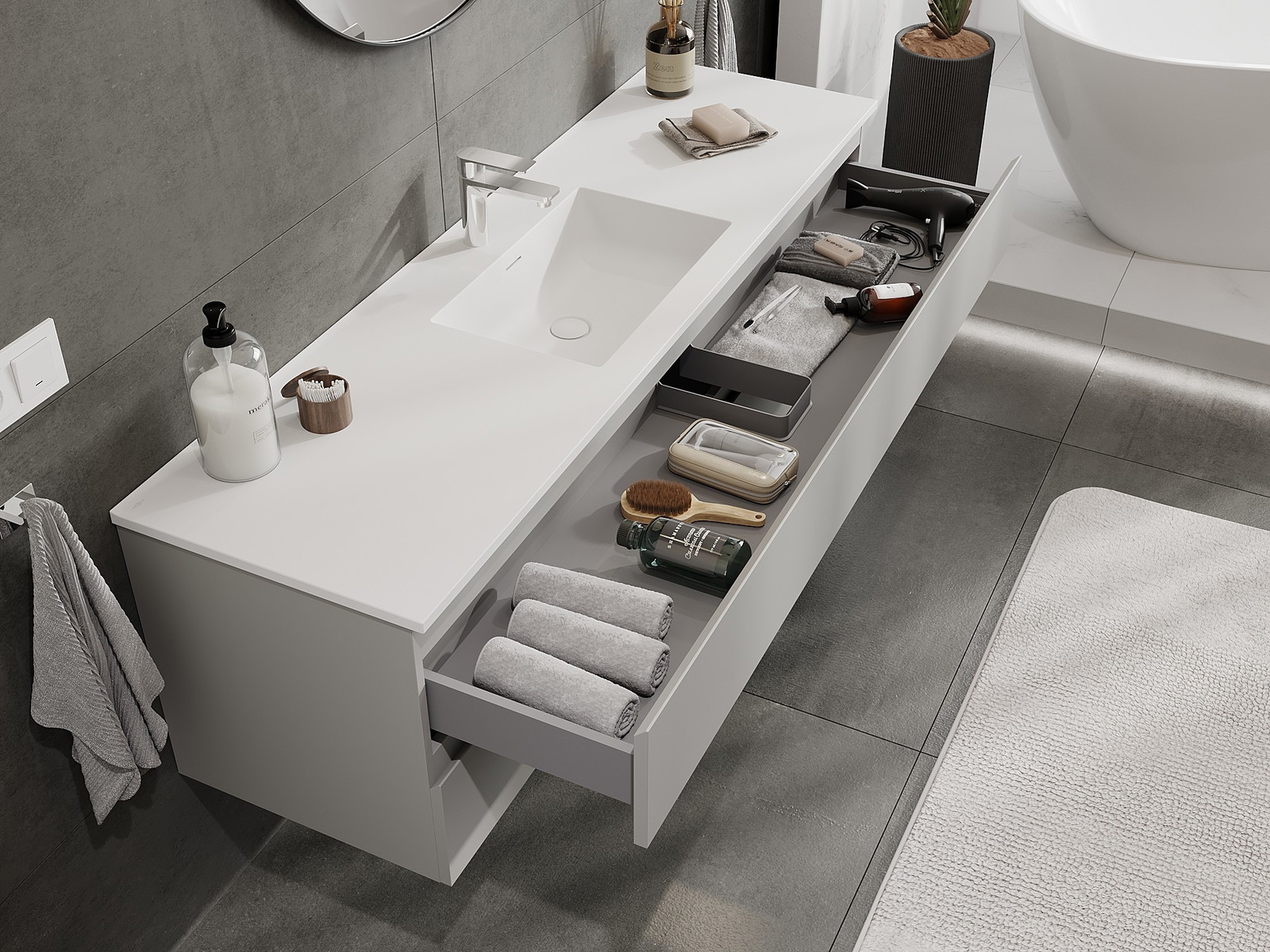 Výrez v zásuvke je navrhnutý tak, aby pojal sifón, ktorý je nevyhnutný v umývadlových inštaláciách. Vďaka tomu môže byť nábytok namontovaný plne funkčne, bez nutnosti vzdávať sa priestoru v zásuvke v prospech inštalácie.