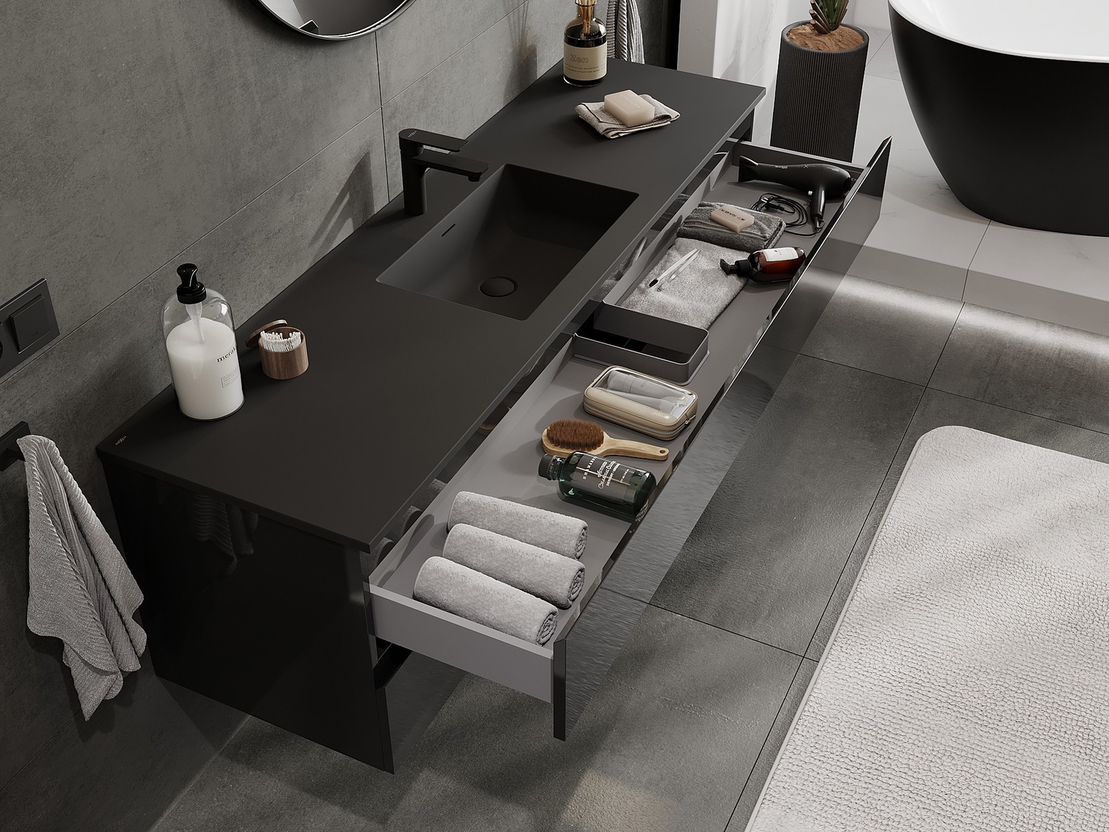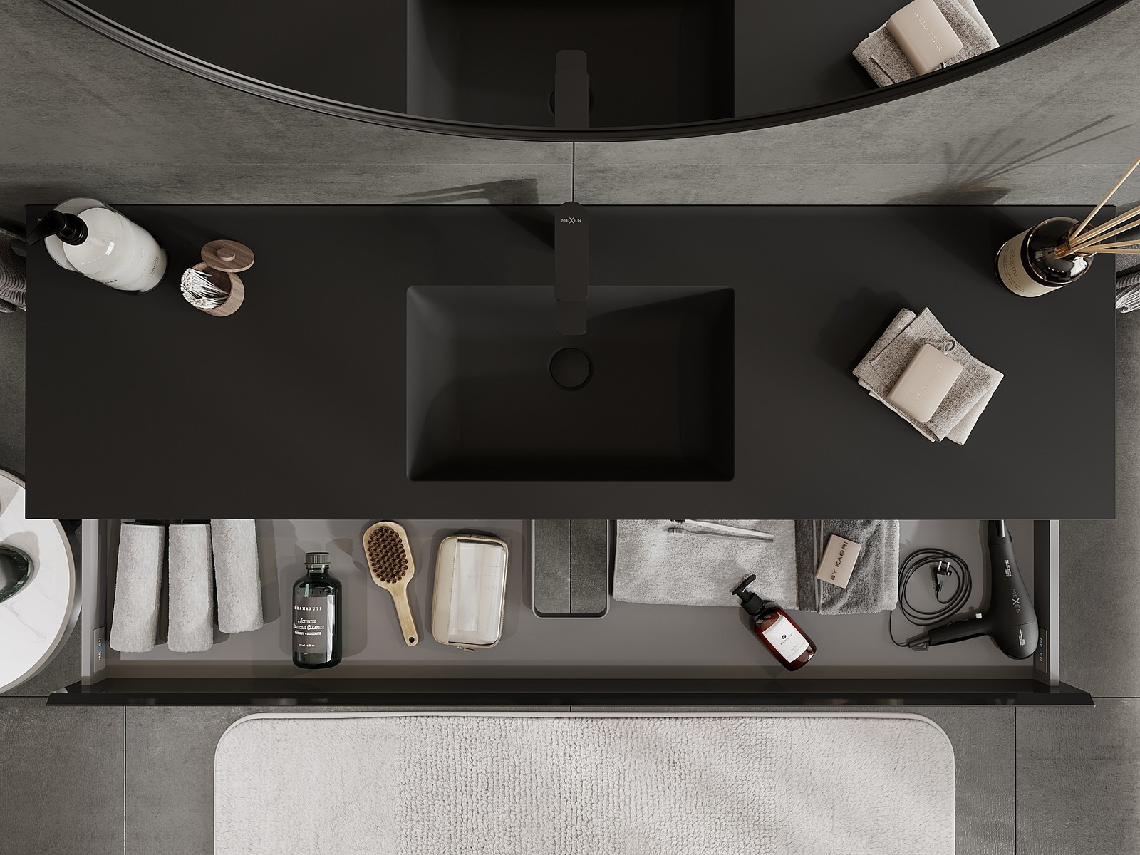 Výrez v zásuvke je navrhnutý tak, aby pojal sifón, ktorý je nevyhnutný v umývadlových inštaláciách. Vďaka tomu môže byť nábytok namontovaný plne funkčne, bez nutnosti vzdávať sa priestoru v zásuvke v prospech inštalácie.