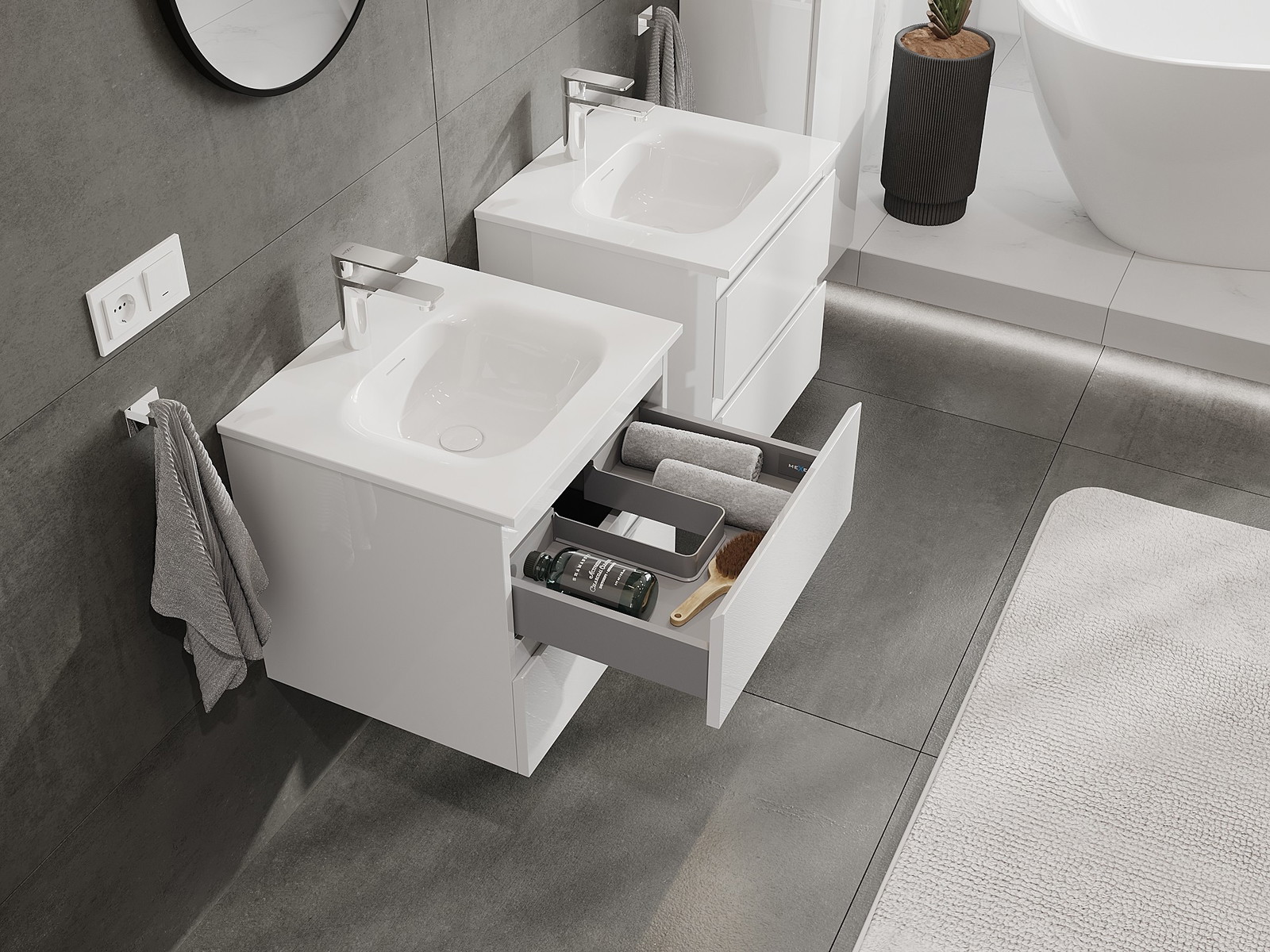 Výrez v zásuvke je navrhnutý tak, aby pojal sifón, ktorý je nevyhnutný v umývadlových inštaláciách. Vďaka tomu môže byť nábytok namontovaný plne funkčne, bez nutnosti vzdávať sa priestoru v zásuvke v prospech inštalácie.