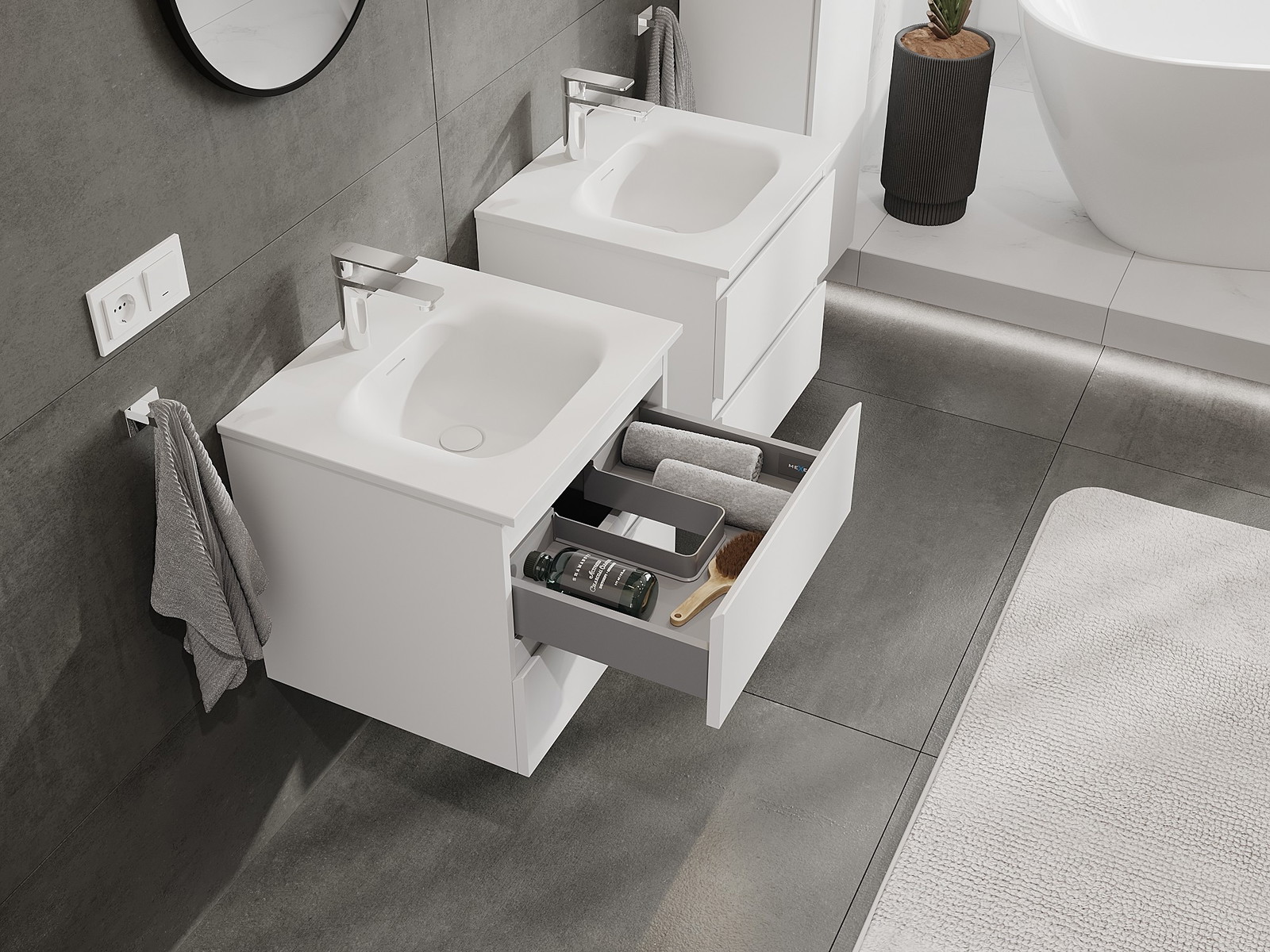 Výrez v zásuvke je navrhnutý tak, aby pojal sifón, ktorý je nevyhnutný v umývadlových inštaláciách. Vďaka tomu môže byť nábytok namontovaný plne funkčne, bez nutnosti vzdávať sa priestoru v zásuvke v prospech inštalácie.