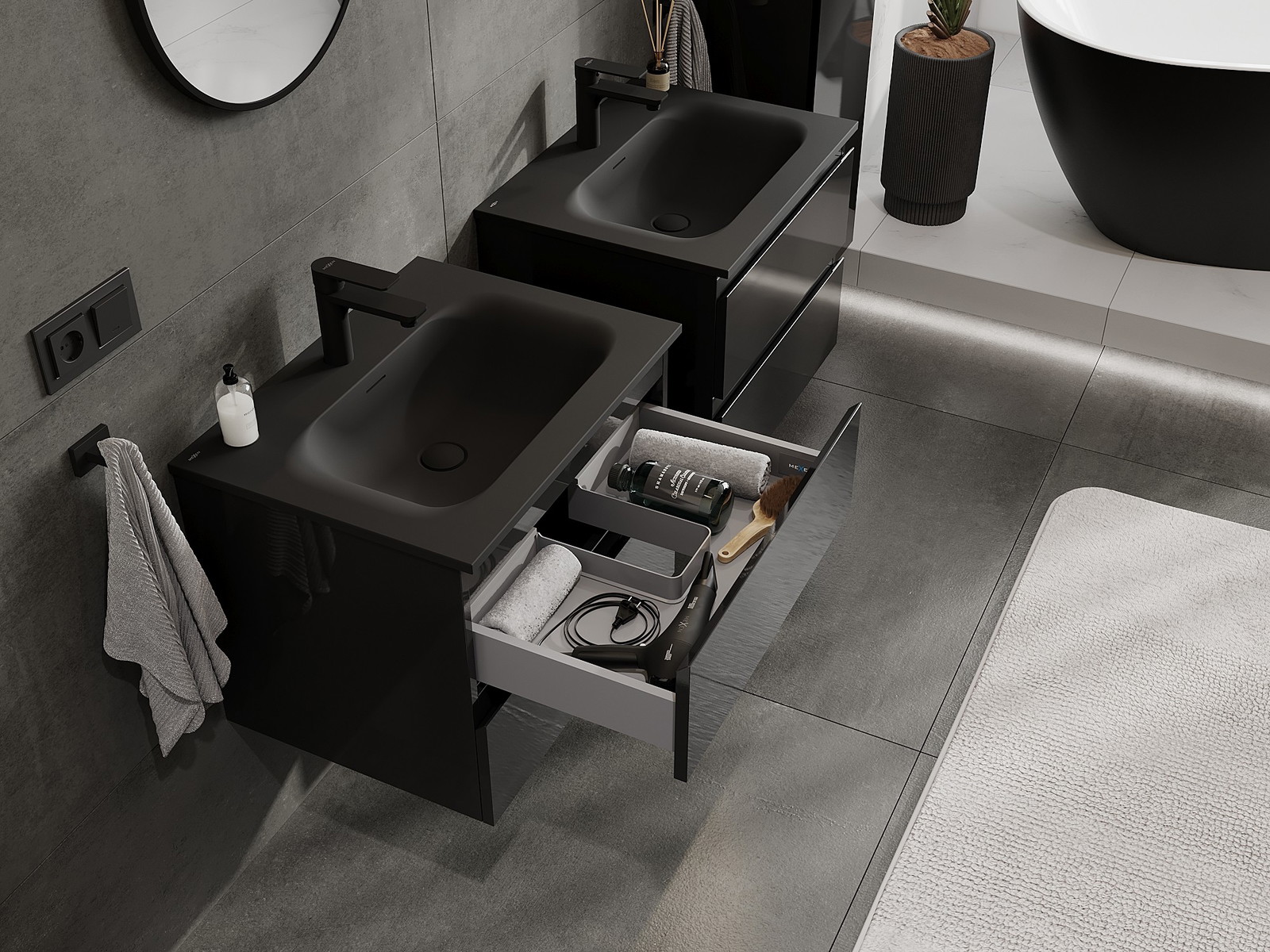 Výrez v zásuvke je navrhnutý tak, aby pojal sifón, ktorý je nevyhnutný v umývadlových inštaláciách. Vďaka tomu môže byť nábytok namontovaný plne funkčne, bez nutnosti vzdávať sa priestoru v zásuvke v prospech inštalácie.