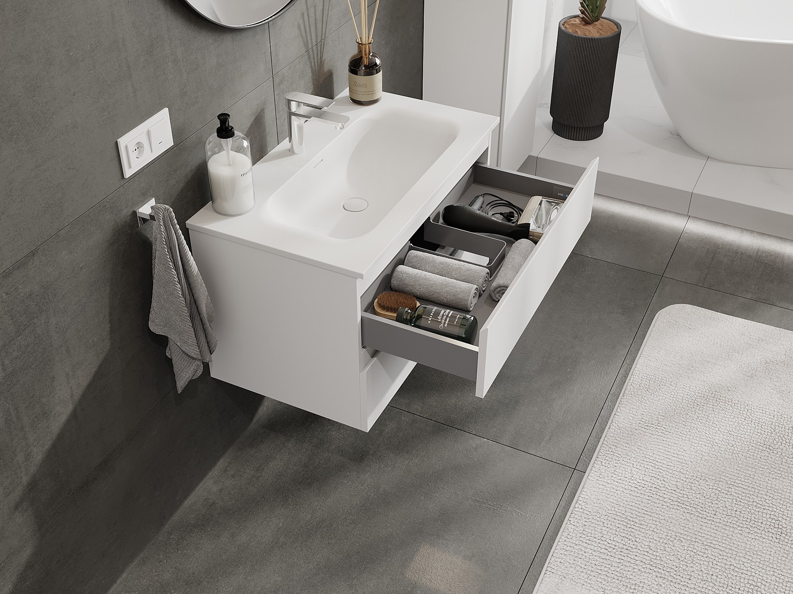 Výrez v zásuvke je navrhnutý tak, aby pojal sifón, ktorý je nevyhnutný v umývadlových inštaláciách. Vďaka tomu môže byť nábytok namontovaný plne funkčne, bez nutnosti vzdávať sa priestoru v zásuvke v prospech inštalácie.