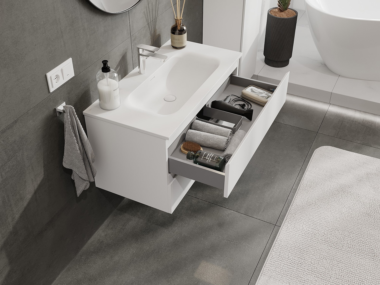 Výrez v zásuvke je navrhnutý tak, aby pojal sifón, ktorý je nevyhnutný v umývadlových inštaláciách. Vďaka tomu môže byť nábytok namontovaný plne funkčne, bez nutnosti vzdávať sa priestoru v zásuvke v prospech inštalácie.