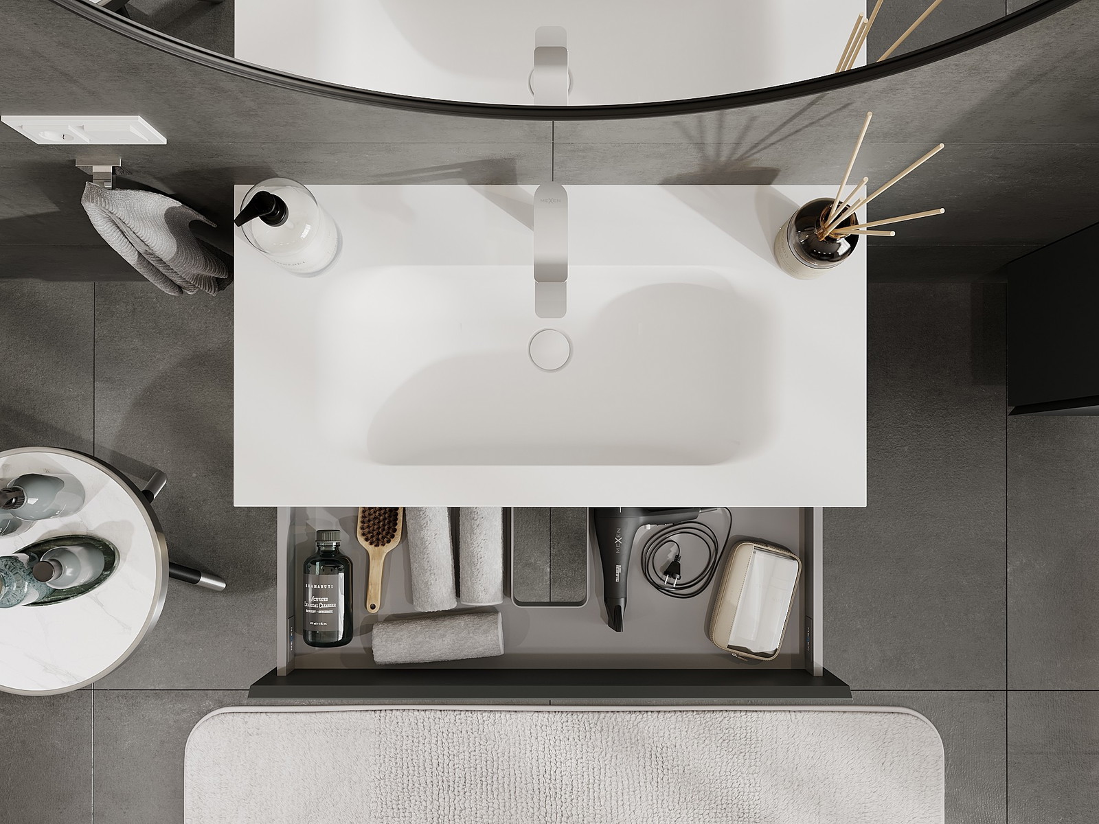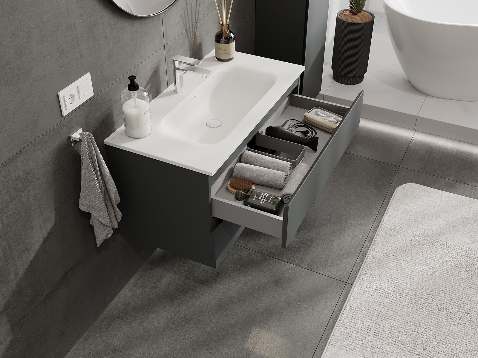 Výrez v zásuvke je navrhnutý tak, aby pojal sifón, ktorý je nevyhnutný v umývadlových inštaláciách. Vďaka tomu môže byť nábytok namontovaný plne funkčne, bez nutnosti vzdávať sa priestoru v zásuvke v prospech inštalácie.