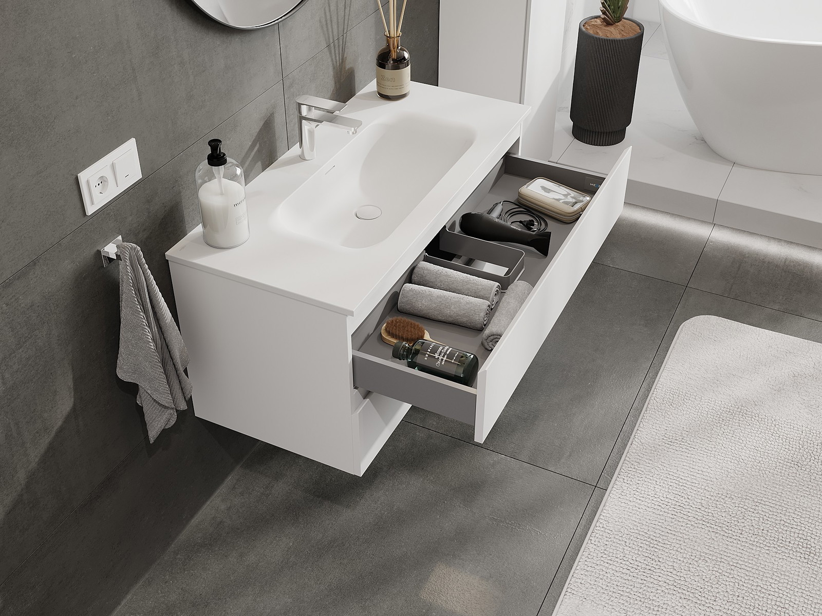 Výrez v zásuvke je navrhnutý tak, aby pojal sifón, ktorý je nevyhnutný v umývadlových inštaláciách. Vďaka tomu môže byť nábytok namontovaný plne funkčne, bez nutnosti vzdávať sa priestoru v zásuvke v prospech inštalácie.