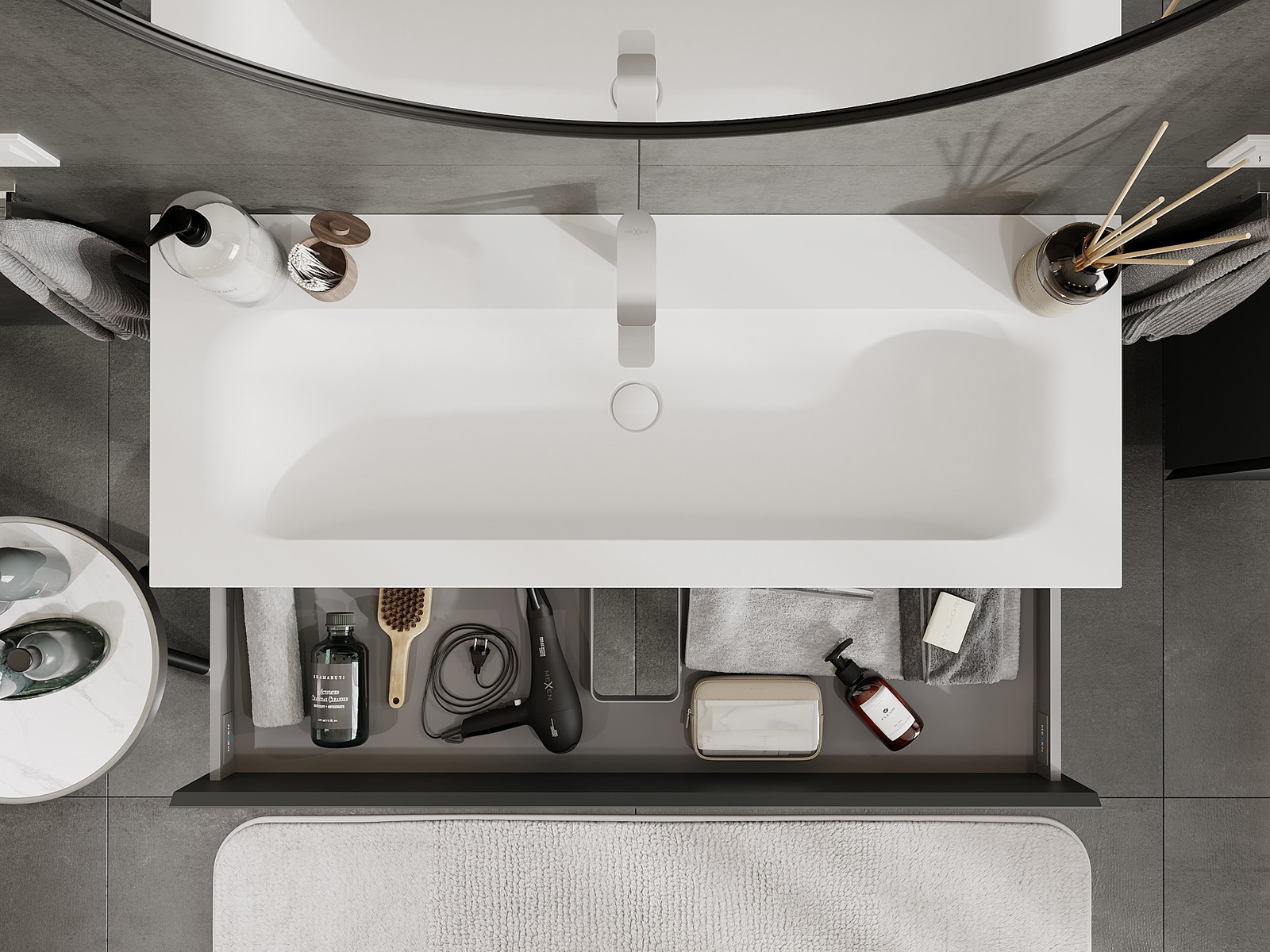 Výrez v zásuvke je navrhnutý tak, aby pojal sifón, ktorý je nevyhnutný v umývadlových inštaláciách. Vďaka tomu môže byť nábytok namontovaný plne funkčne, bez nutnosti vzdávať sa priestoru v zásuvke v prospech inštalácie.