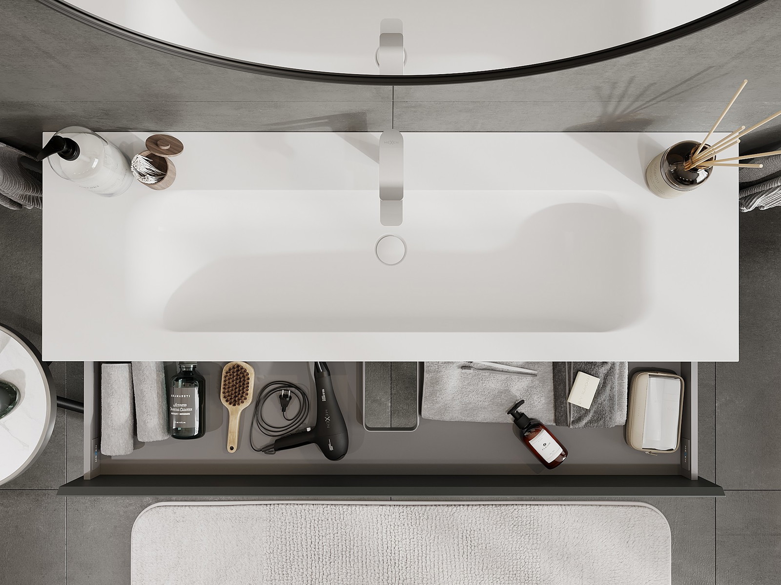 Výrez v zásuvke je navrhnutý tak, aby pojal sifón, ktorý je nevyhnutný v umývadlových inštaláciách. Vďaka tomu môže byť nábytok namontovaný plne funkčne, bez nutnosti vzdávať sa priestoru v zásuvke v prospech inštalácie.