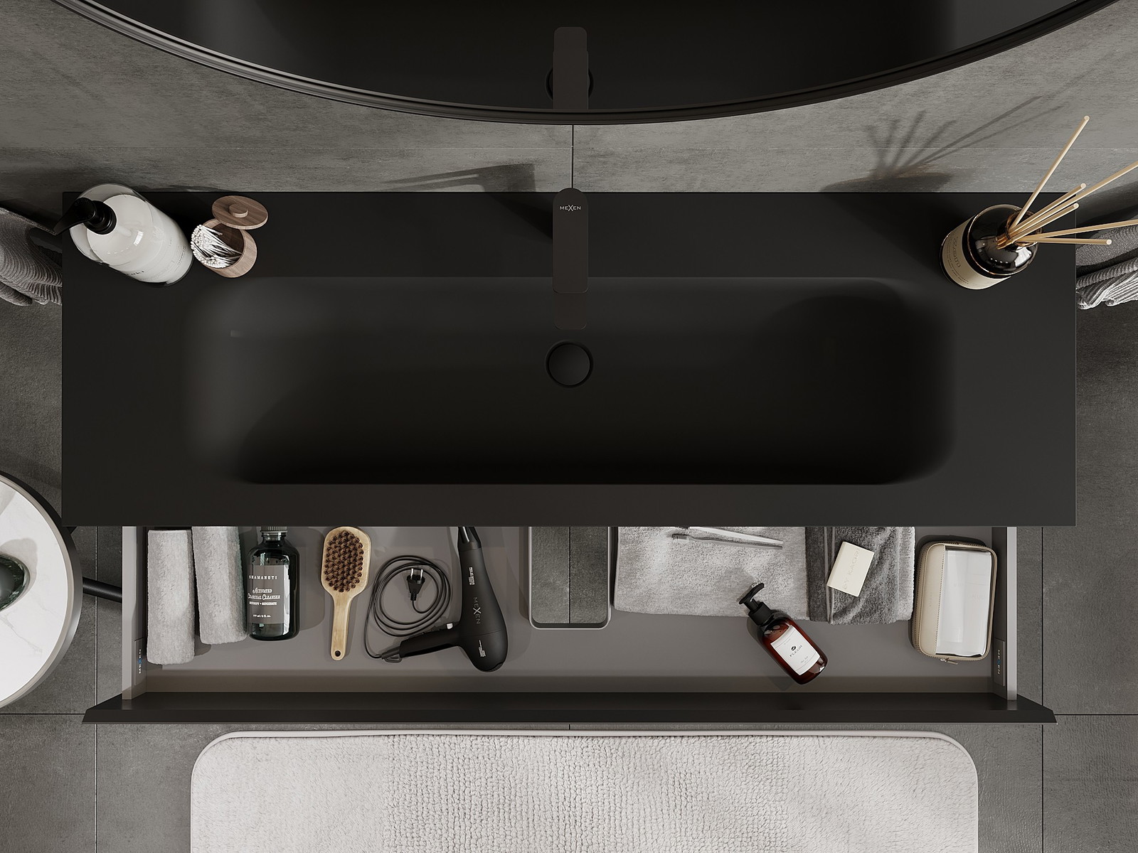 Výrez v zásuvke je navrhnutý tak, aby pojal sifón, ktorý je nevyhnutný v umývadlových inštaláciách. Vďaka tomu môže byť nábytok namontovaný plne funkčne, bez nutnosti vzdávať sa priestoru v zásuvke v prospech inštalácie.