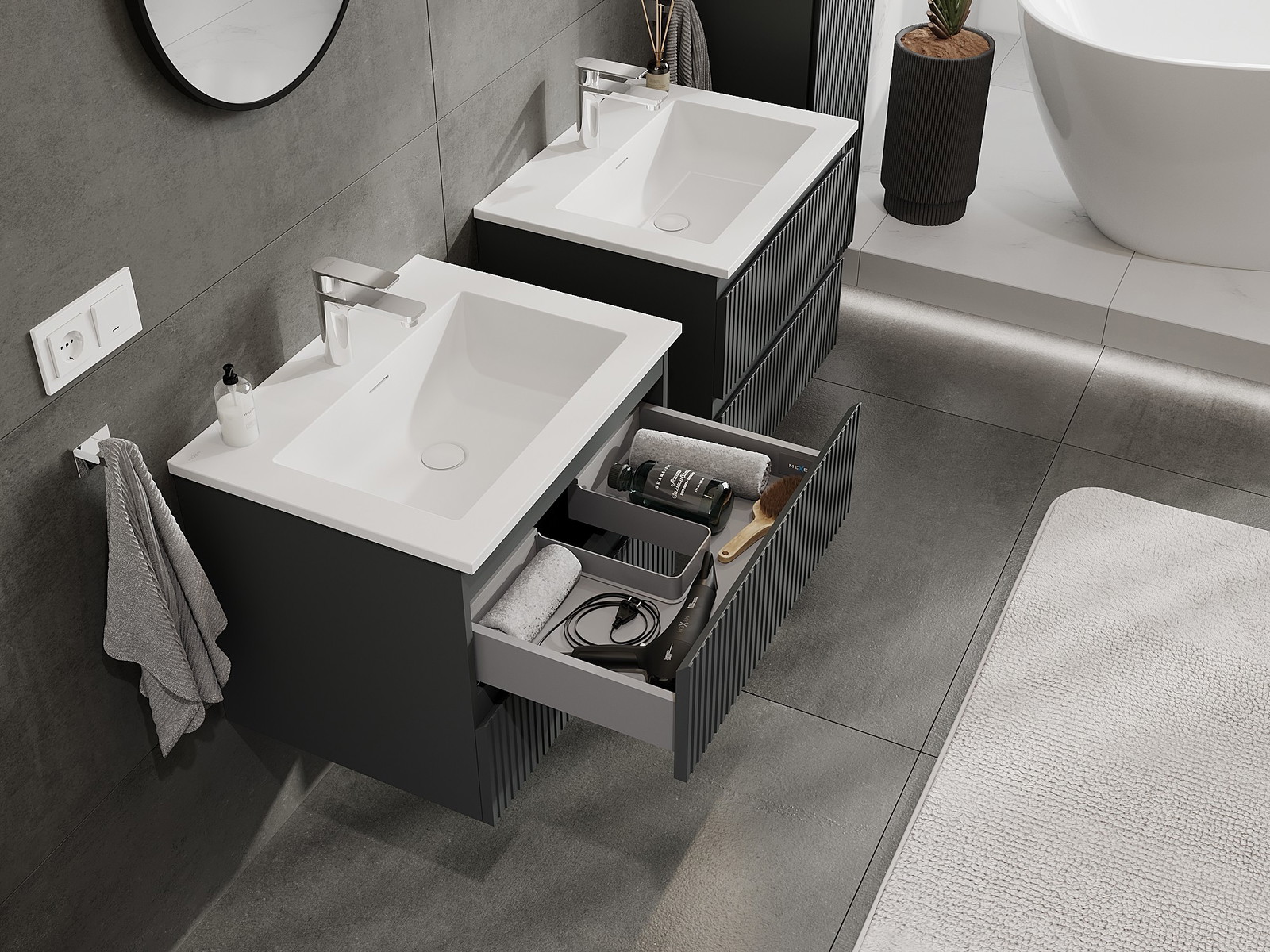 Výrez v zásuvke je navrhnutý tak, aby pojal sifón, ktorý je nevyhnutný v umývadlových inštaláciách. Vďaka tomu môže byť nábytok namontovaný plne funkčne, bez nutnosti vzdávať sa priestoru v zásuvke v prospech inštalácie.