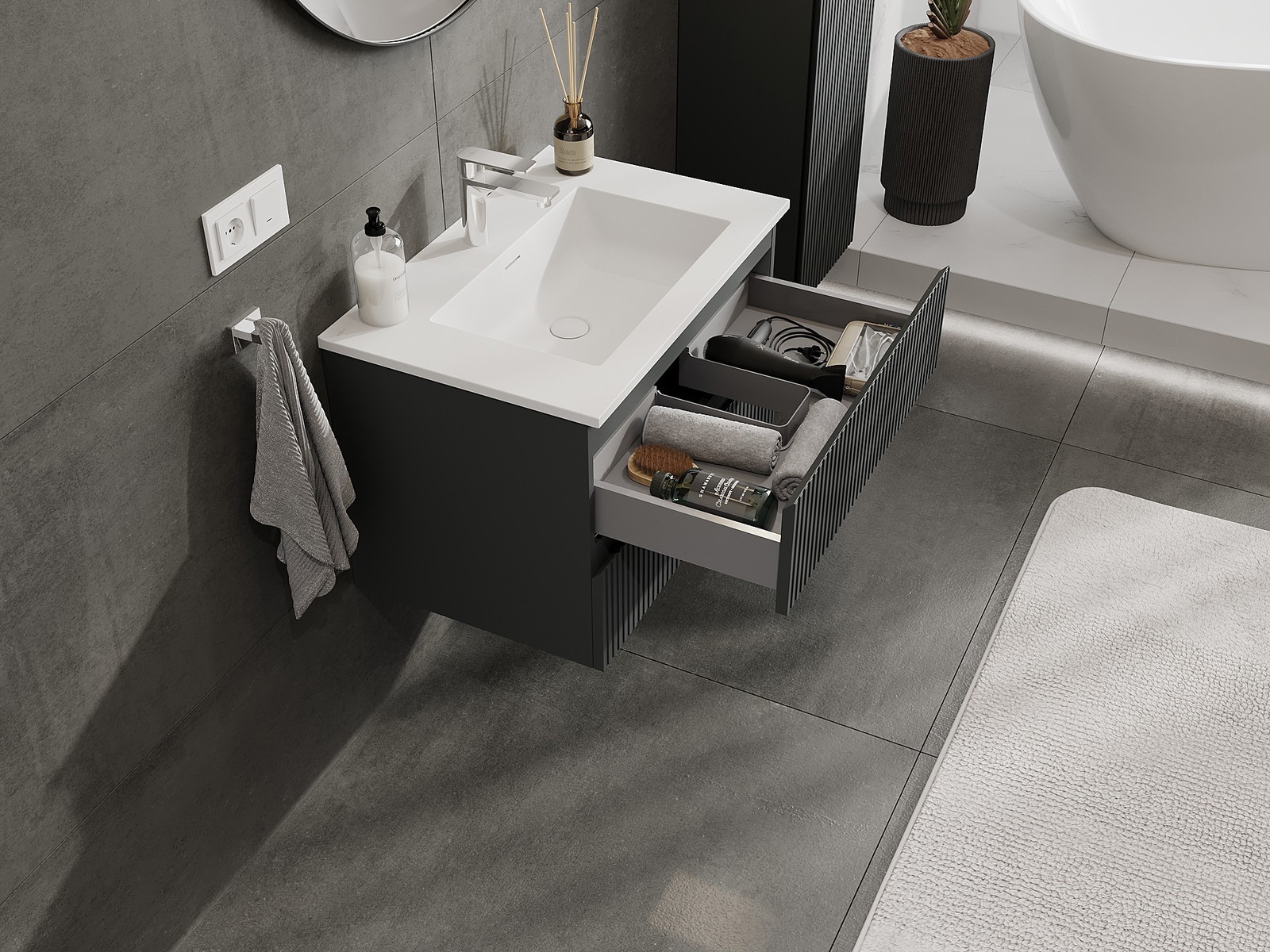 Výrez v zásuvke je navrhnutý tak, aby pojal sifón, ktorý je nevyhnutný v umývadlových inštaláciách. Vďaka tomu môže byť nábytok namontovaný plne funkčne, bez nutnosti vzdávať sa priestoru v zásuvke v prospech inštalácie.
