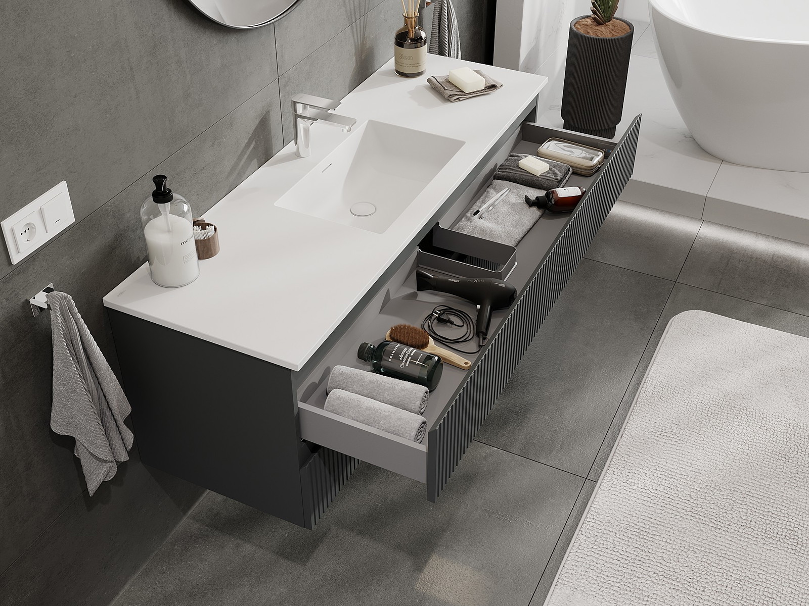 Výrez v zásuvke je navrhnutý tak, aby pojal sifón, ktorý je nevyhnutný v umývadlových inštaláciách. Vďaka tomu môže byť nábytok namontovaný plne funkčne, bez nutnosti vzdávať sa priestoru v zásuvke v prospech inštalácie.